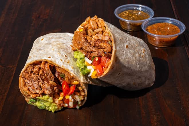 Refried pinto beans, rice, pico de gallo, sour cream, guacamole, mixed cheese wrapped in a flour tortilla with a side of roja salsa and tomatillo salsa. Contains: Milk, Soy, Wheat.