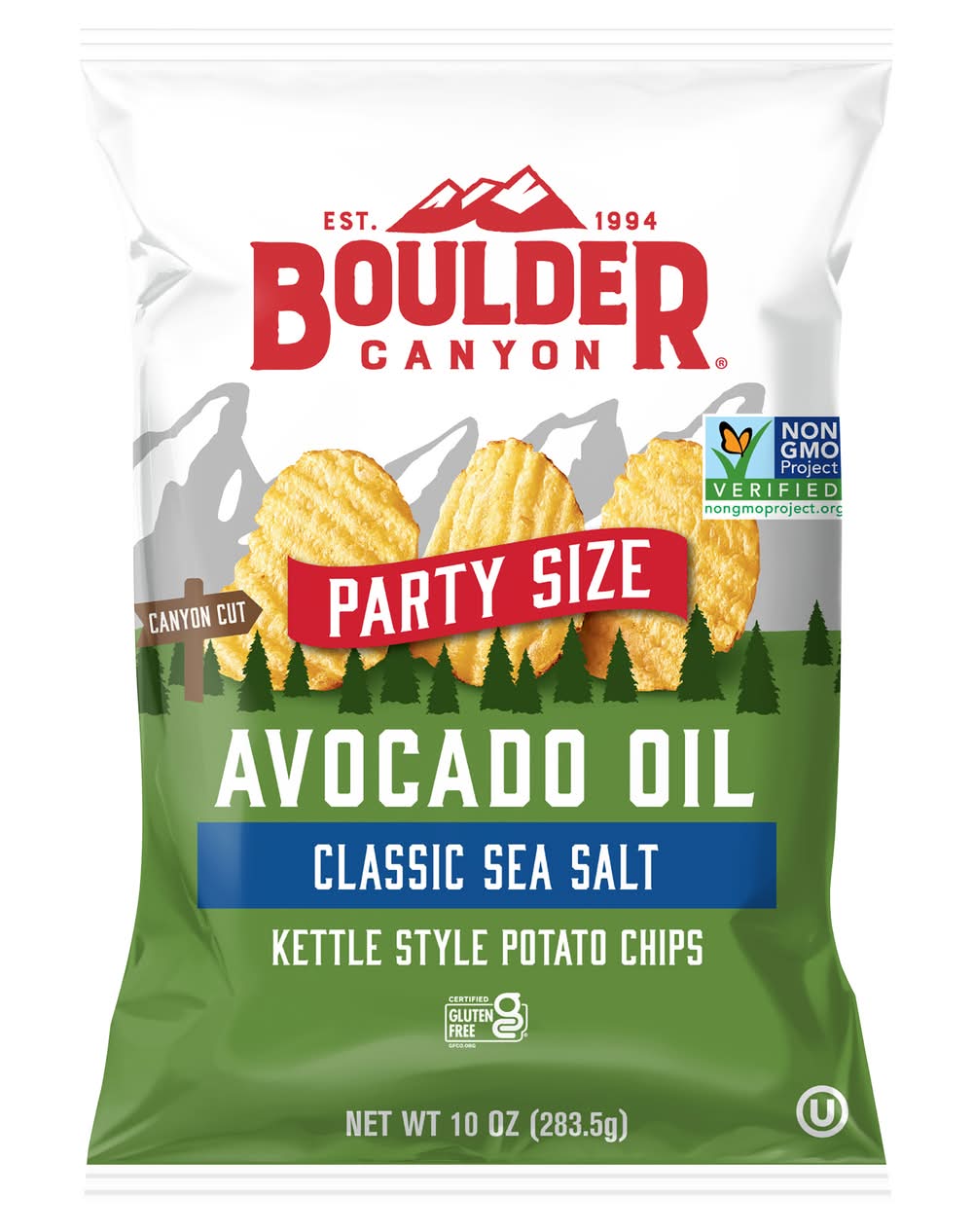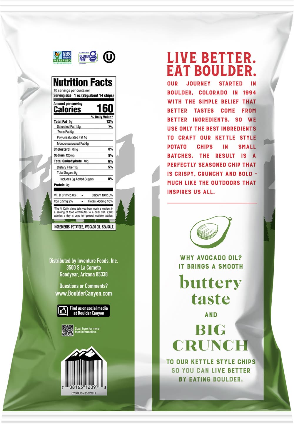 Kettle style potato chips Certified gluten free. Non-GMO Project verified. nongmoproject.org. Live better. Eat boulder. Our journey started in boulder, Colorado in 1994 with the simple belief that better tastes come from better ingredients. So we use only the best ingredients to craft our kettle style роtatο chips in small batches. It brings a smooth buttery taste and big crunch to our kettle style chips so you can live better by eating boulder.