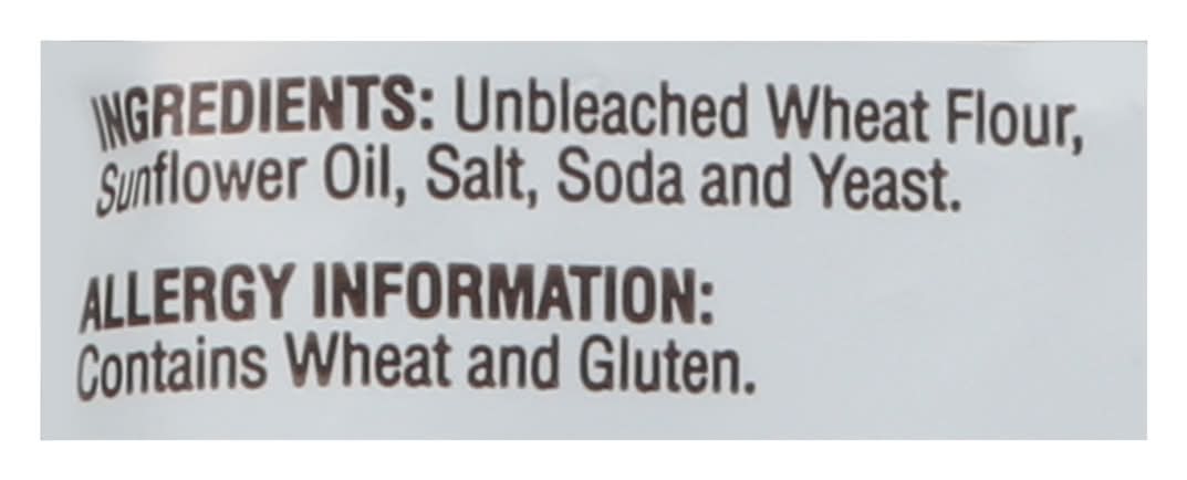 Ingredients: Unbleached Wheat Flour, Sunflower Oil, Salt, Soda and Yeast Contains: Wheat, Gluten