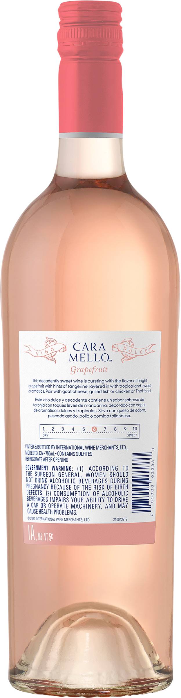 Decadently Sweet. Grape Wine with natural flavors. This decadently sweet wine is bursting with the flavor of bright grapefruit with hints of tangerine, layered in with tropical and sweet aromatics. Pair with goat cheese, grilled fish or chicken or Thai food. 6. Alc. 9% by vol. 18 Vinted & bottled by International Wine Merchants, Ltd., Modesto, CA. • Alcohol by volume: 9% • $0.10 deposit included