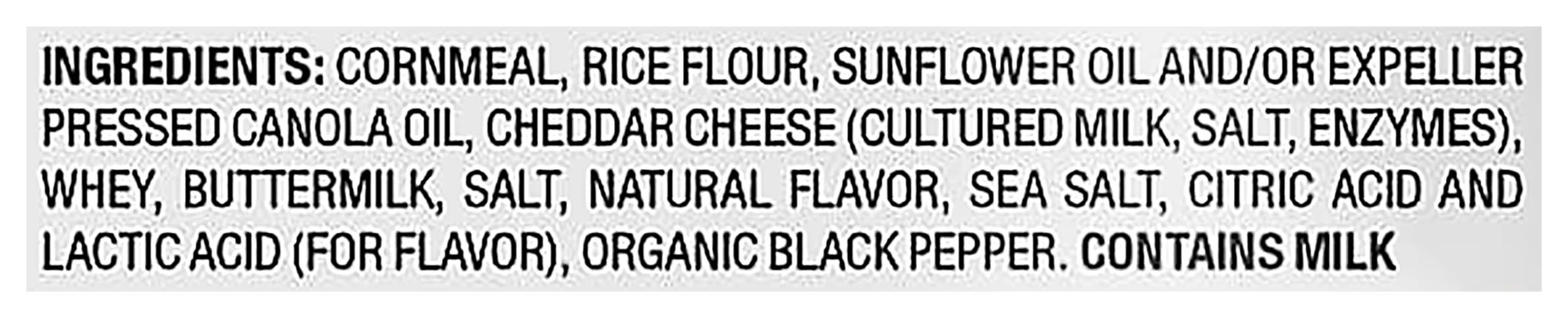 Ingredients: Cornmeal, Rice Flour, Sunflower Oil and/or Expeller Pressed Canola Oil, Cheddar Cheese (Cultured Milk, Salt, Enzymes), Whey, Buttermilk, Salt, Natural Flavor, Sea Salt, Citric Acid and Lactic Acid (for Flavor), Organic Black Pepper. Contains: Dairy, Lactose, Milk Additives: Genetically Modified Ingredients