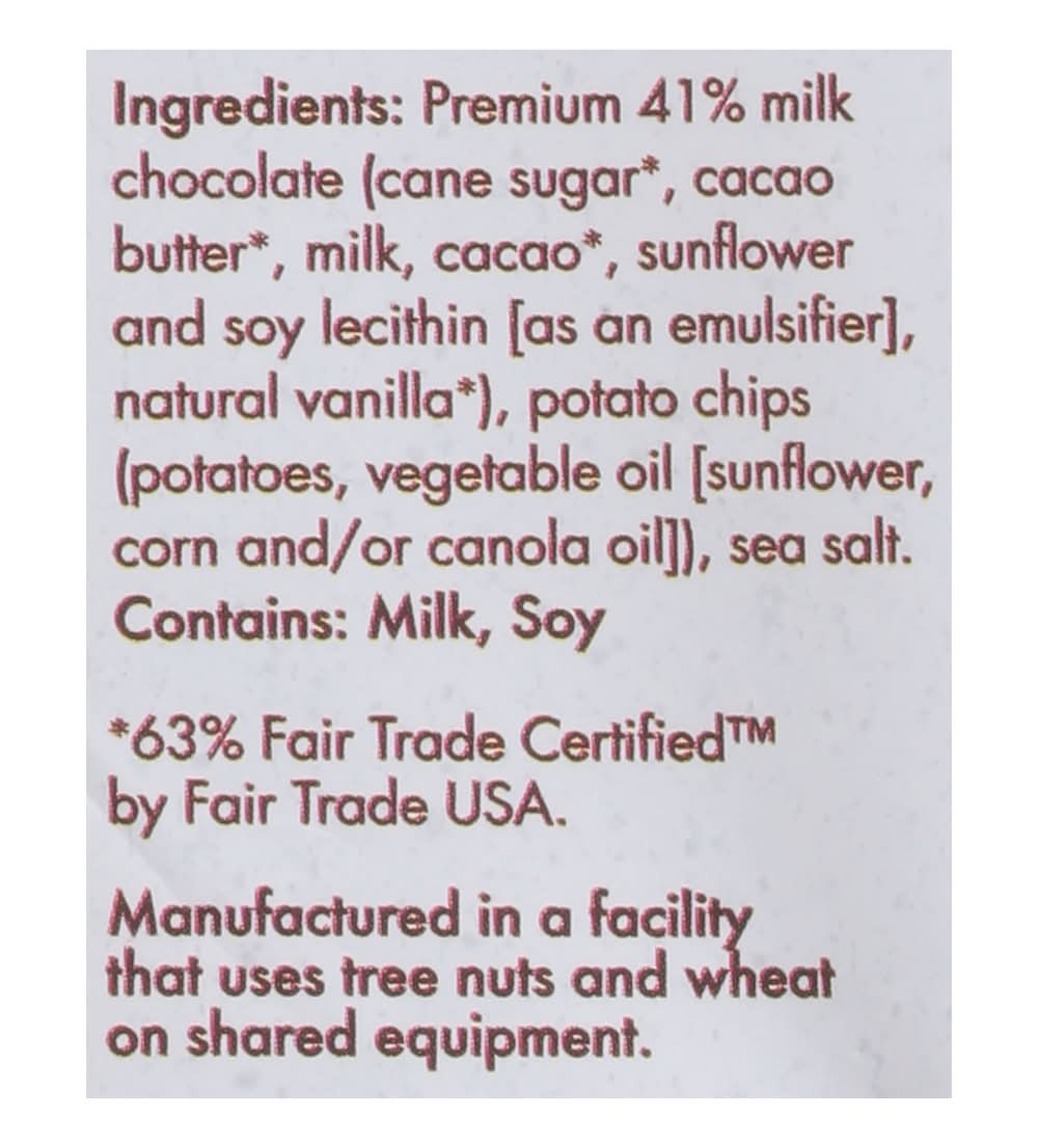 Ingredients: Premium 41% Milk Chocolate (Cane Sugar (63% Fair Trade Certified by Fair Trade USA), Cacao Butter (63% Fair Trade Certified by Fair Trade USA), Milk, Cacao (63% Fair Trade Certified by Fair Trade USA), Sunflower Lecithin [as an Emulsifier], Natural Vanilla (63% Fair Trade Certified by Fair Trade USA)), Potato Chips (Potatoes, Vegetable Oil [Sunflower, Corn and/or Canola Oil]), Sea Salt Contains: Milk, Soybeans, Corn, Tree Nuts, Wheat