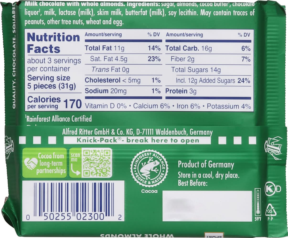 Ritter Sport Milk Chocolate With Whole Almonds (3.5 oz)
