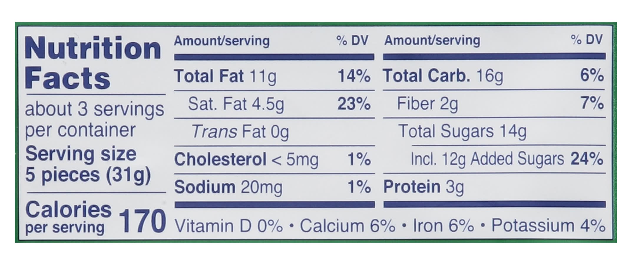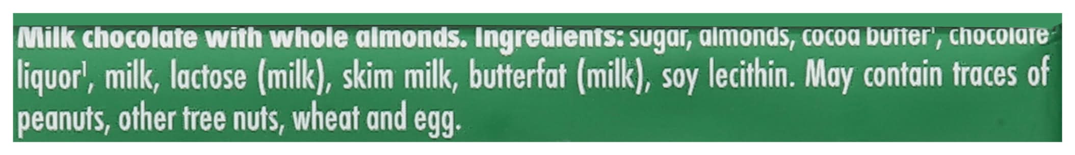Ingredients: Sugar, Almonds, Cocoa Butter (a), Chocolate Liquor (a), Milk, Lactose (Milk), Skim Milk, Butterfat (Milk), Soy Lecithin. (a) Rainforest Alliance Certified Contains: Milk, Soybeans, Lactose, Peanuts, Wheat, Eggs, Tree Nuts