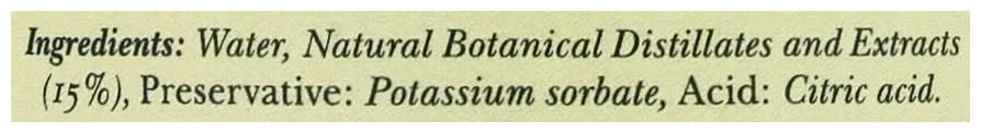 Ingredients: Water, Natural Botanical Distillates and Extracts (15%), Preservative: Potassium Sorbate, Acid: Citric Acid