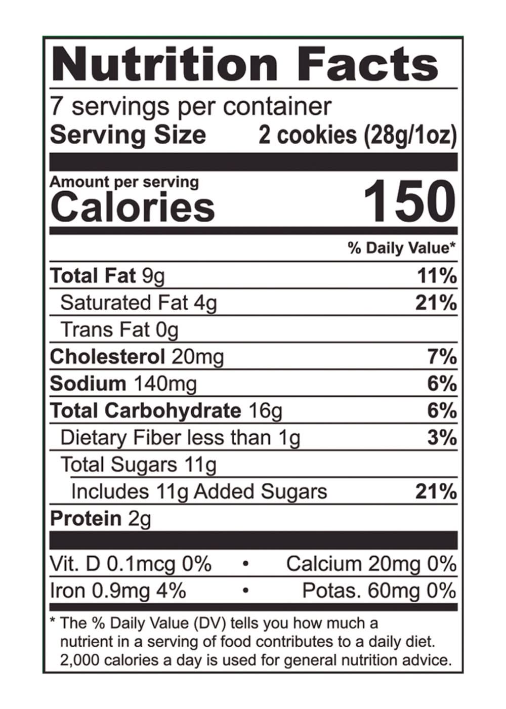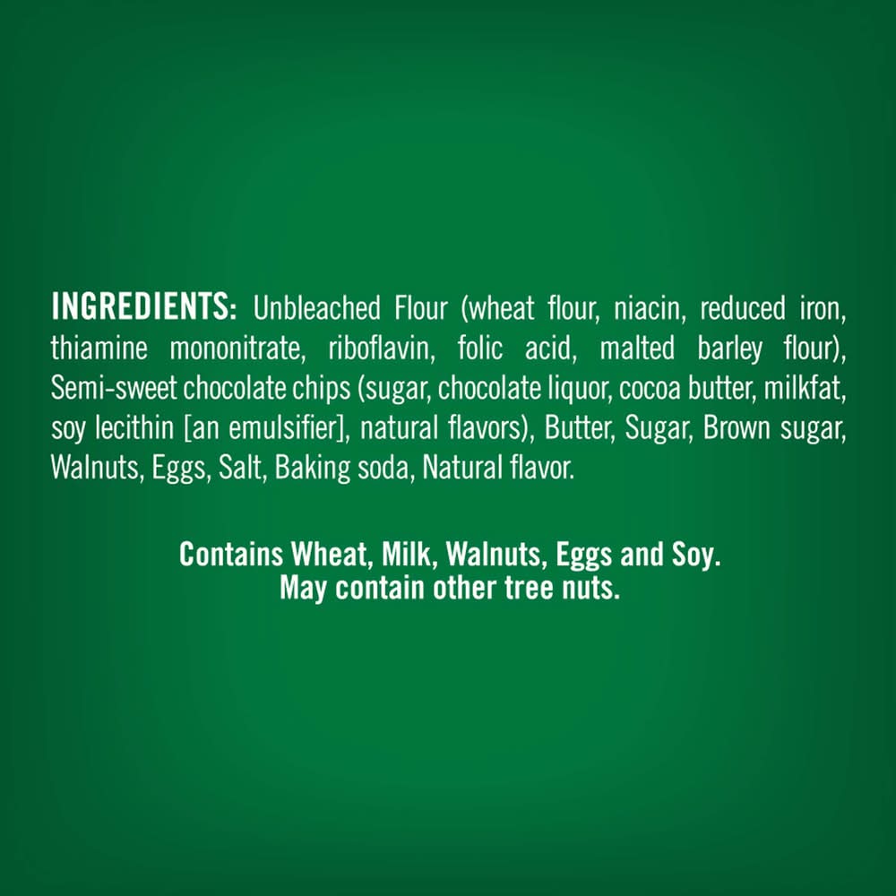 Ingredients: Ingredients: Semi-sweet chocolate chips (sugar, chocolate liquor, cocoa butter, milk fat, soy lecithin [an emulsifier], vanilla, natural flavor), Unbleached Flour (wheat flour, niacin, reduced iron, thiamine mononitrate, riboflavin, folic acid, malted barley flour), Butter, Cane sugar, Brown cane sugar, Walnuts, Eggs, Baking Soda, Salt, and Natural vanilla flavor. Contains: Wheat, Milk, Egg, Soy, Wallnut