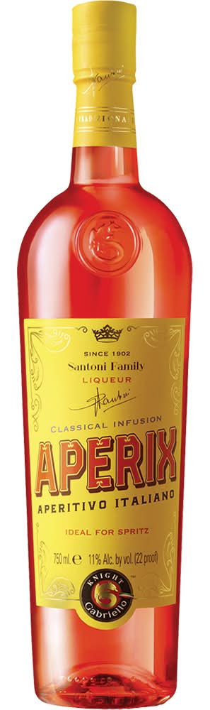 Knight Gabriello Aperix Aperitivo is a delicate Italian aperitif characterized by its bright orange hue and lively character. Offering a distinct and well-balanced blend of sweet and tart flavors, it is crafted through quality infusions of orange, herbs, and roots, complemented by rhubarb to add a gentle bitterness. This combination creates a harmonious sensory experience. • Alcohol by volume: 11% • $0.10 deposit included