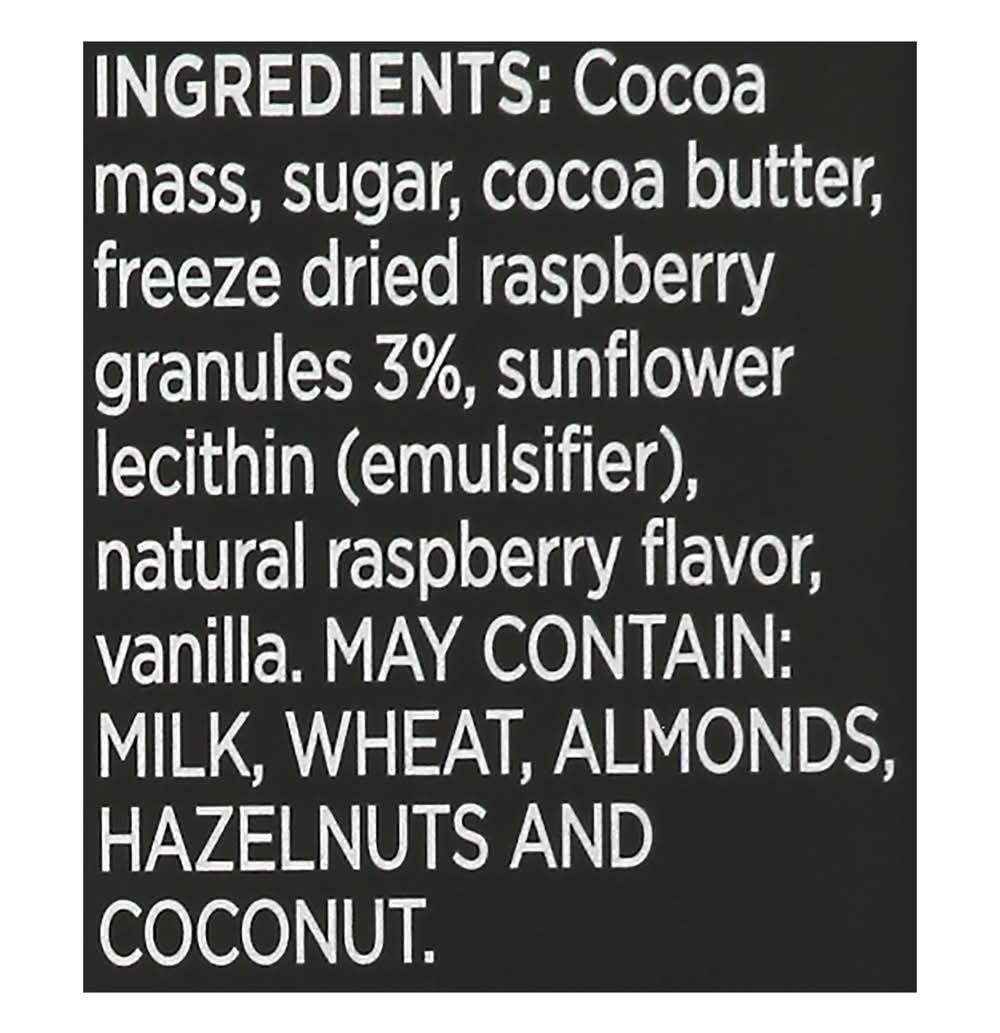 Ingredients: Cocoa Mass, Sugar, Cocoa Butter, Freeze Dried Raspberry Granules 3%, Sunflower Lecithin (Emulsifier), Natural Raspberry Flavor, Vanilla Contains: Milk, Wheat, Tree Nuts