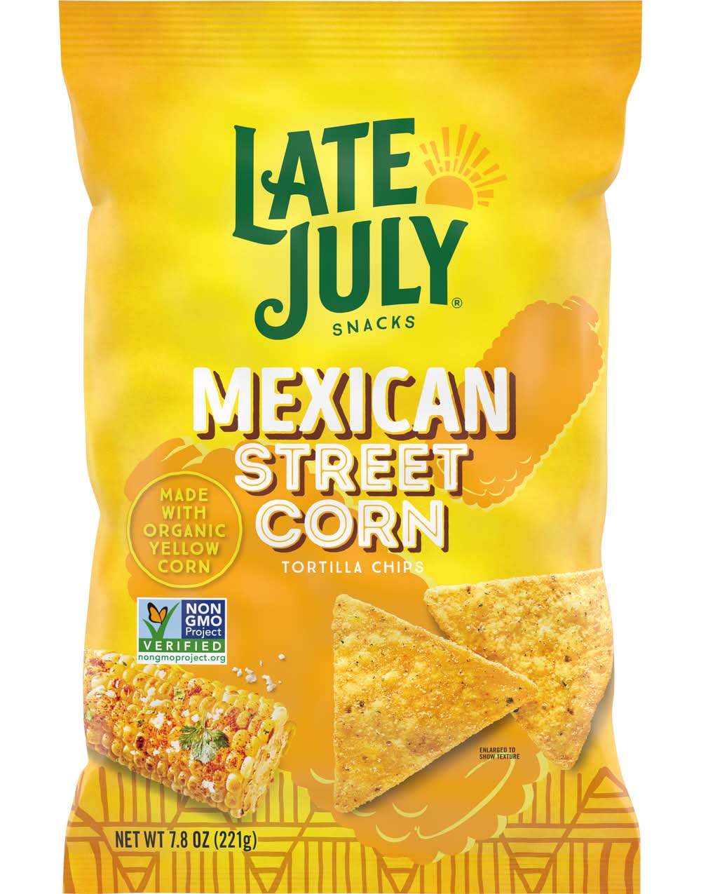 Get ready for the deliciously bold taste of Late July Mexican Street Corn Tortilla Chips. Our tortilla chips are made with organic corn and seasonings and inspired by real ingredients for an amazingly delicious taste that you can enjoy right out of the bag. We hope you’ll love them as much as we do. Late July is the sweet spot of summer. It’s a moment in time when life is simple, pure and good. And our chips take you there, any time of year. It’s also our name and our snack-making philosophy. Since 2003, we have been obsessed with crafting the world’s most delicious snacks with only the finest organic and non-GMO project verified ingredients. Our 100% whole-grain chips are made with organic corn, they’re kosher, are certified gluten free, and contain no artificial flavors or preservatives. There are about 8 servings per 7.8-oz. bag of Late July Tortilla Chips. Thanks for snacking with us. • Late July Snacks, Charlotte,NC,28277 • Packaging: Reusable