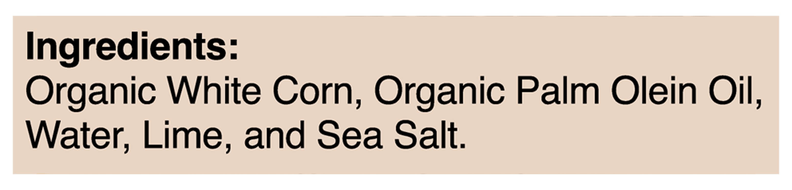 Ingredients: Organic White Corn, Organic Vegetable Oil (Organic Palm Olein Oil, or Organic Sunflower Oil), Water, Lime, and Sea Salt Contains: Corn