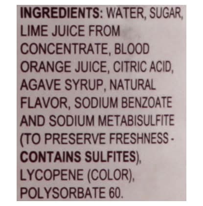 Ingredients: Water, Sugar, Lime Juice from Concentrate, Blood Orange Juice, Citric Acid, Agave Syrup, Natural Flavor, Sodium Benzoate and Sodium Metabisulfite (to Preserve Freshness Contains Sulfites), Lycopene (Color), Polysorbate 60