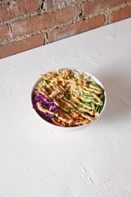 Organic Hoisin Tofu OR Beyond Meat Vegan Chicken | White Rice | Peanut Sauce | Cucumbers | Carrots | Cabbage | Crispy Rice Noodles | Cilantro