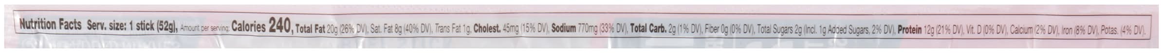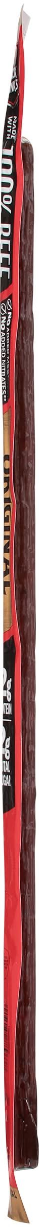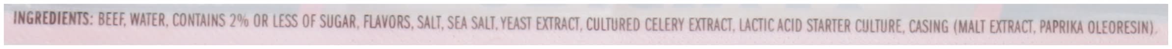 Ingredients: Beef, Water, Salt, Contains 2% or Less of Sugar, Flavors, Yeast Extract, Lactic Acid Starter Culture, Casing (Caramel, Beta Carotene). Contains: Celery