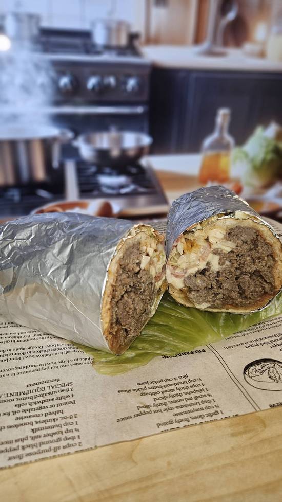 Pan, bistec, ketchup, papitas, queso suizo, mayoketchup, tomate, repollo.