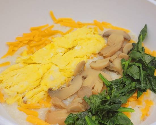 Bowl of grits with spinach, mushrooms, cheddar cheese, and 2 eggs.