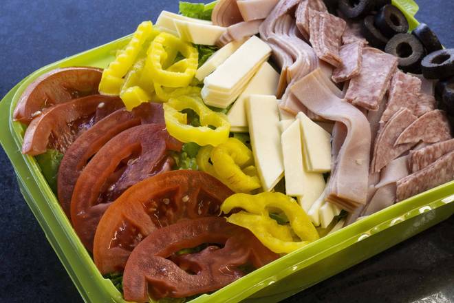 Crisp iceberg lettuce with ham, hard salami, white American cheese, tomatoes, mild peppers, and black olives (Please use special instructions add a note box to remove any unwanted toppings).
