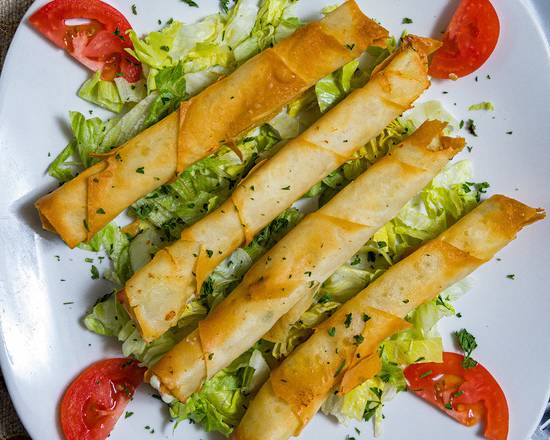 Phyllo dough stuffed with feta cheese, sautéed spinach, and dill, and pan fried until golden brown.