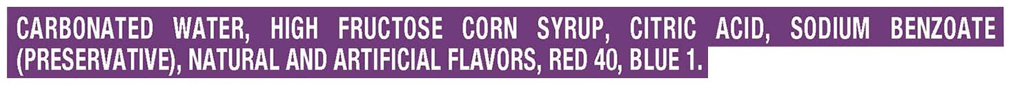 Ingredients: Carbonated Water, High Fructose Corn Syrup, Citric Acid, SodiumBenzoate Preservative, Natural and Artificial Flavors, Red 40, Blue 1.