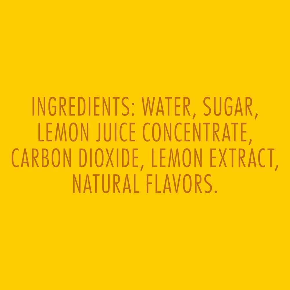 Ingredients: WATER, SUGAR, LEMON JUICE CONCENTRATE, CARBON DIOXIDE, LEMON EXTRACT, NATURAL FLAVORS. Contains: According to the FDA, the most common food allergens are milk, peanuts, eggs, fish, Crustacean shellfish, soybeans, tree nuts, wheat, and sesame. This product does not contain any of these allergens.