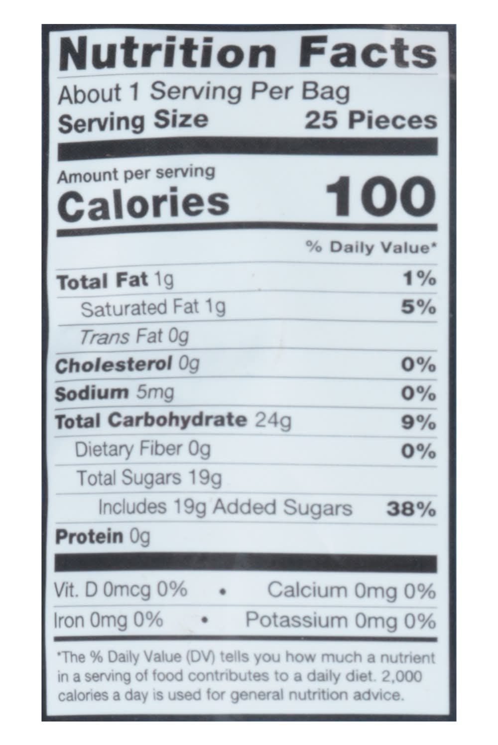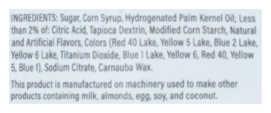 Ingredients: Sugar, Corn Syrup, Hydrogenated Palm Kernel Oil; Less than 2% of: Citric Acid, Tapioca Dextrin, Modified Corn Starch, Natural and Artificial Flavors, Colors (Red 40 Lake, Yellow 5 Lake, Blue 2 Lake, Yellow 6 Lake, Titanium Dioxide, Blue 1 Lake, Yellow 6, Red 40, Yellow 5, Blue 1), Sodium Citrate, Carnauba Wax Contains: Corn, Milk, Tree Nuts, Almonds, Eggs, Soybeans, Tree Nuts, Coconuts