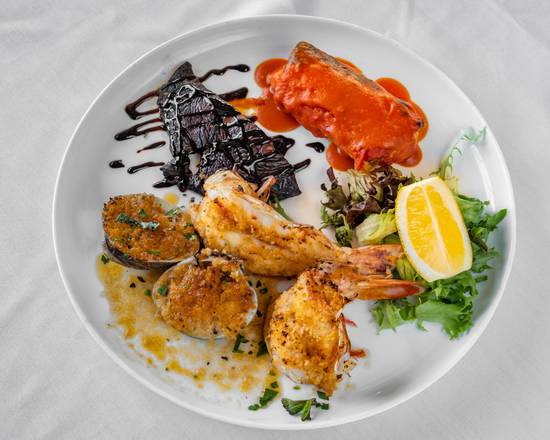 Shrimp, clams, mushrooms and eggplant rollatini in a light marinara sauce.