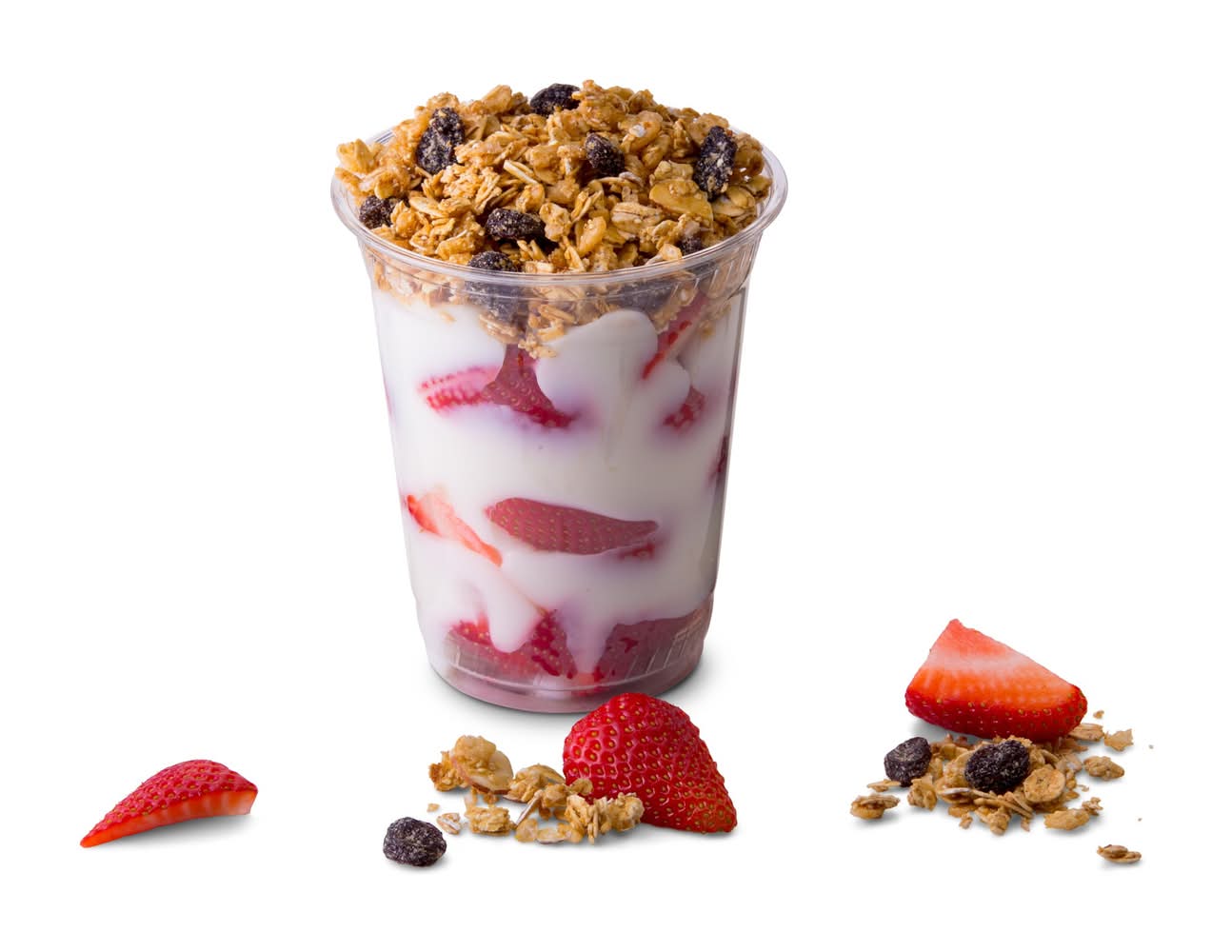 Handmade with fresh cut strawberries, vanilla yogurt, and low-fat granola.