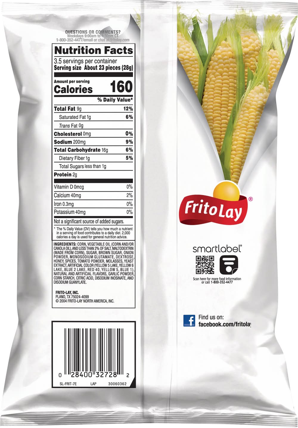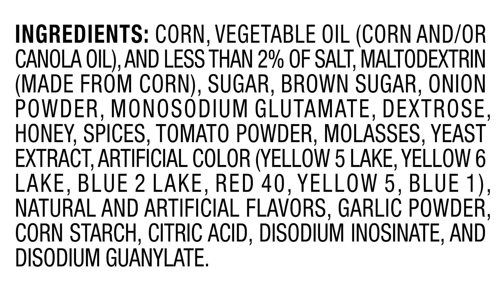 Ingredients: Corn, Vegetable Oil (Corn and/or Canola Oil), and Less Than 2% Of Salt, Maltodextrin (Made From Corn), Sugar, Brown Sugar, Onion Powder, Monosodium Glutamate, Dextrose, Honey, Spices, Tomato Powder, Molasses, Yeast Extract, Artificial Color (Yellow 5 Lake Yellow 6 Lake Blue 2 Lake Red 40 Yellow 5 Blue 1), Natural And Artificial Flavors, Garlic Powder, Corn Starch, Citric Acid, Disodium Inosinate, And Disodium Guanylate Contains: Corn