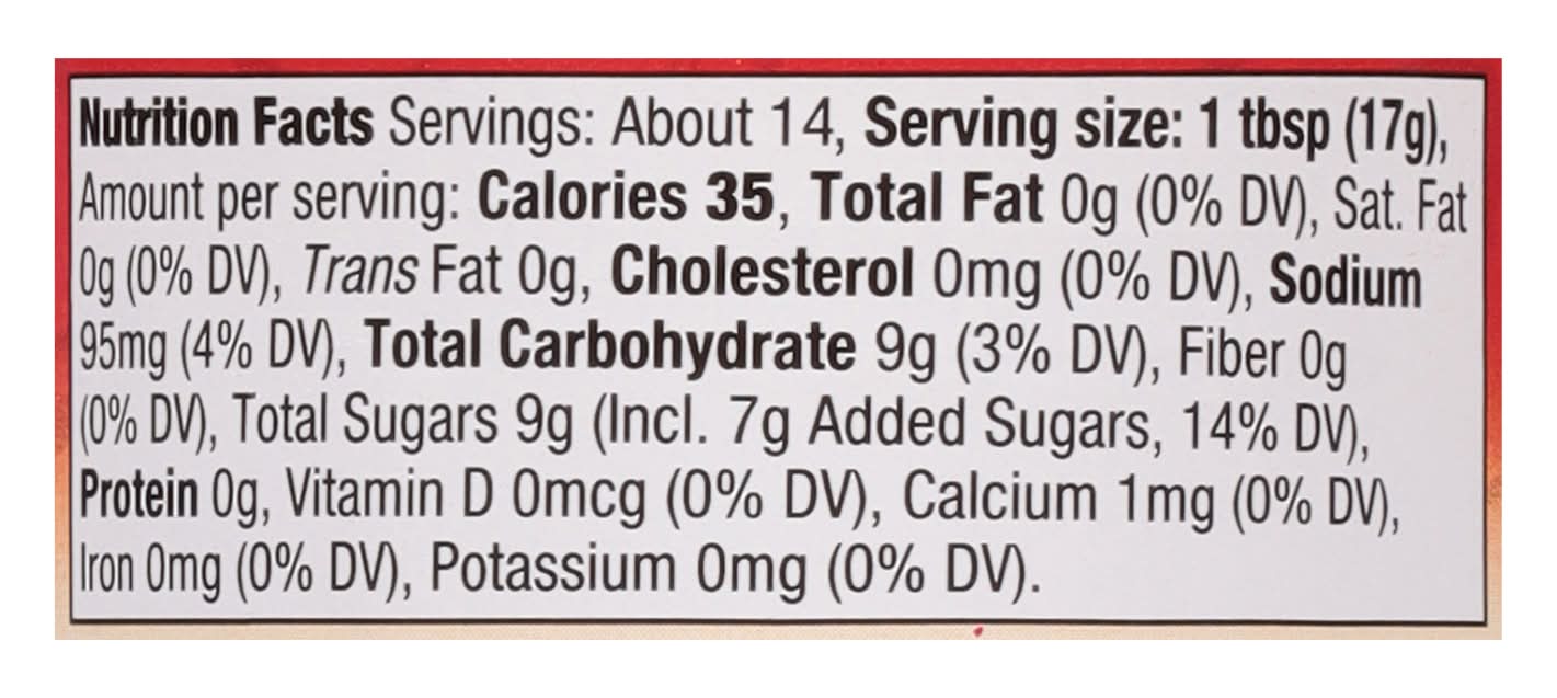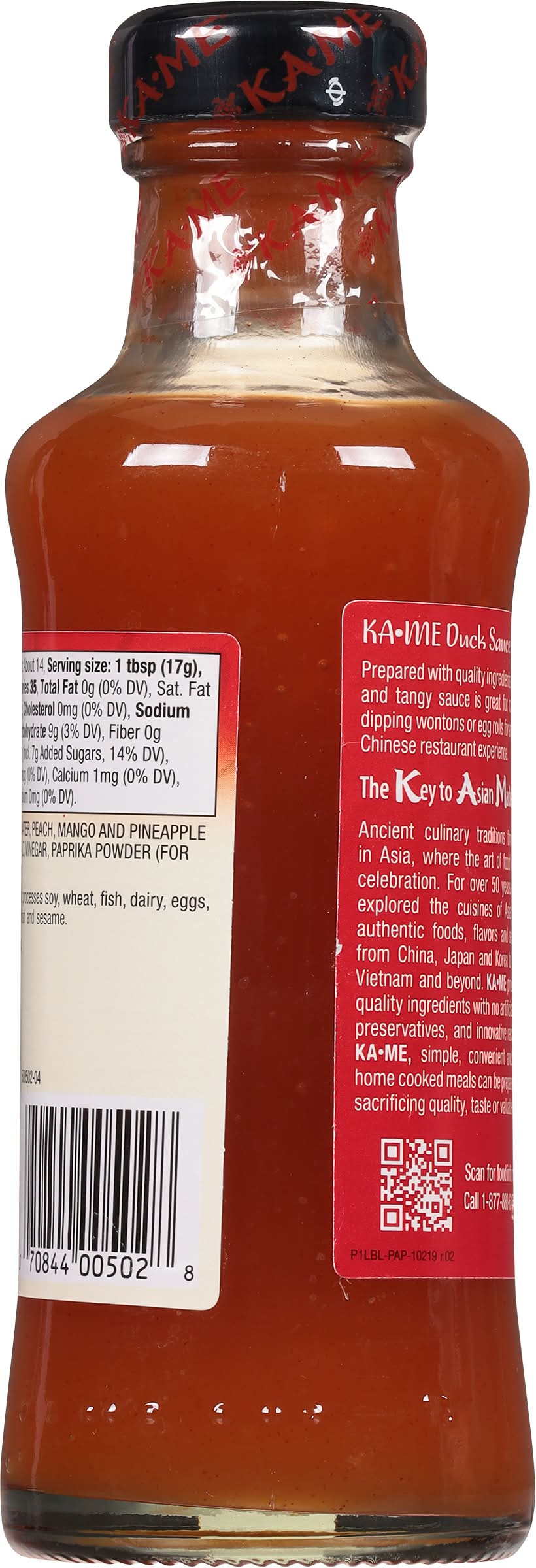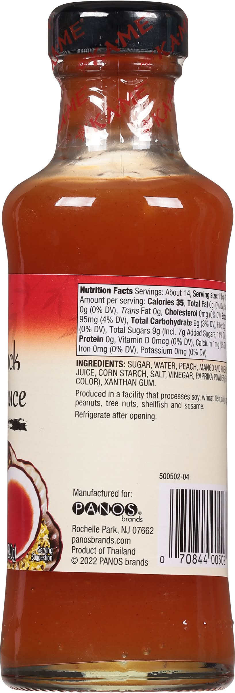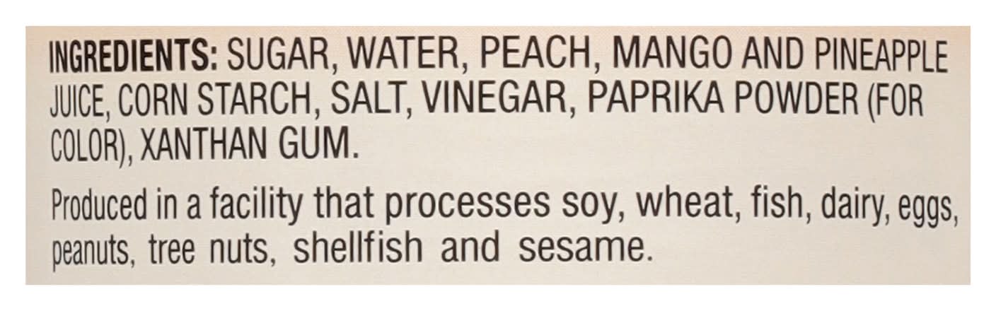 Ingredients: Sugar, Water, Peach, Mango and Pineapple Juice, Corn Starch, Salt, Vinegar, Paprika Powder for Color, Xanthan Gum. Contains: Corn, Soybeans, Wheat, Fish, Milk, Eggs, Peanuts, Tree Nuts, Crustacean Shellfish, Sesame