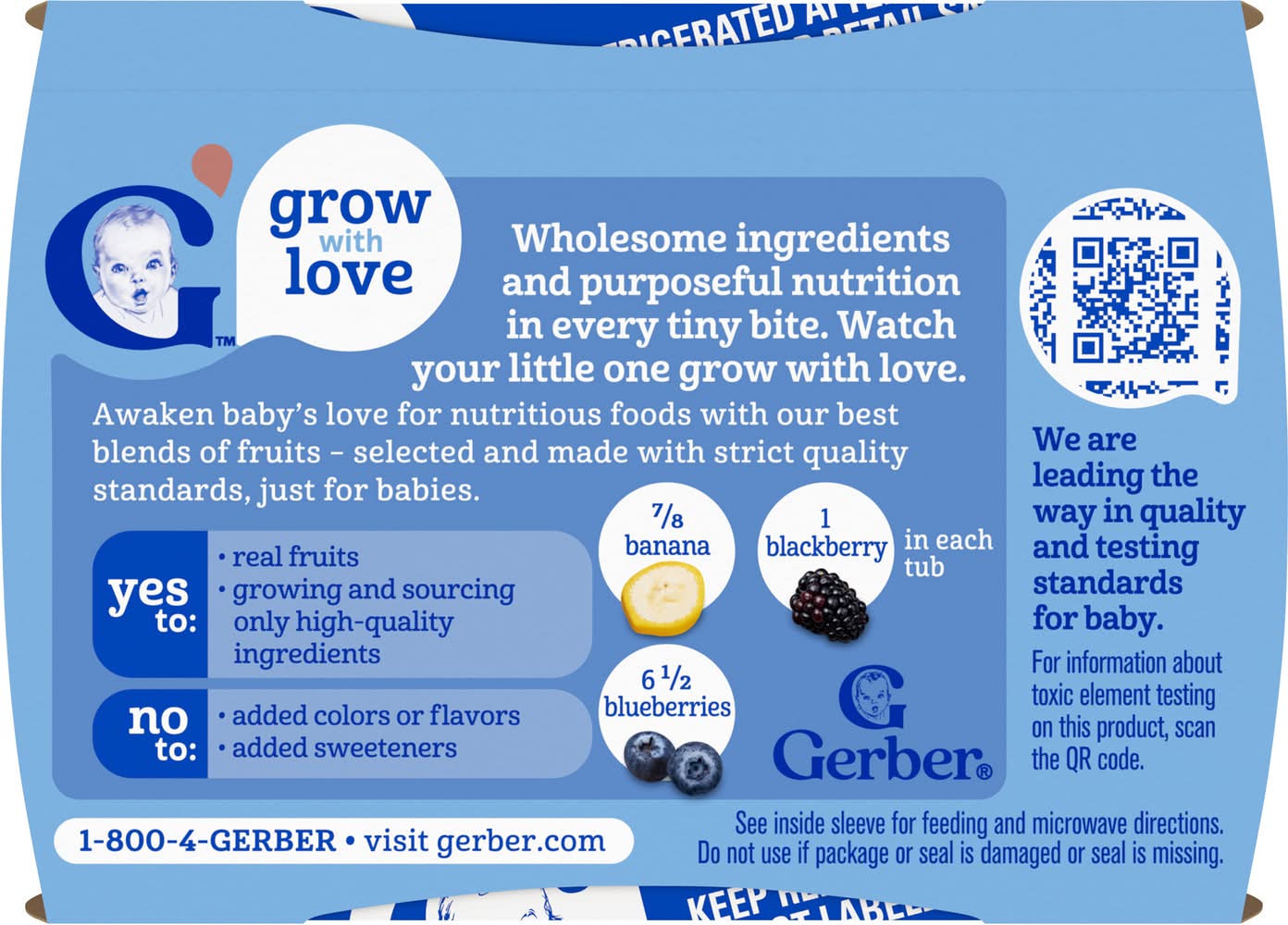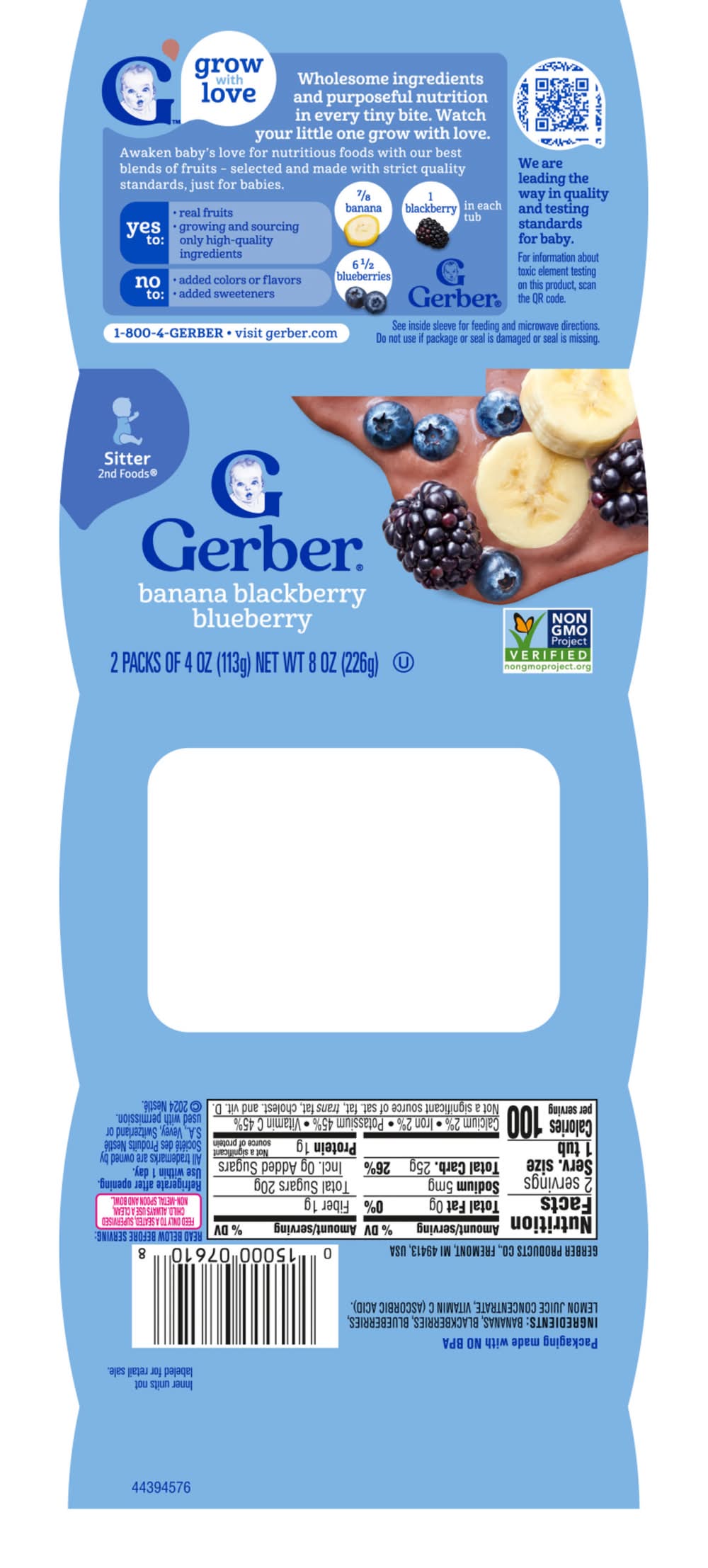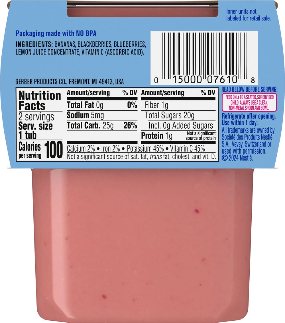No artificial flavors or colors. Non GMO Project verified. nongmoproject.org. The Goodness Inside: 7/8 banana; 1 blackberry; 6-1/2 blueberries. We know where every banana is grown, right down to the farms and fields. Inner units not labels for retail sale. Packaging made with no BPA. • Flavor: Banana-blackberry-blueberry • Gerber Products Co., Fremont,MI,49413,USA