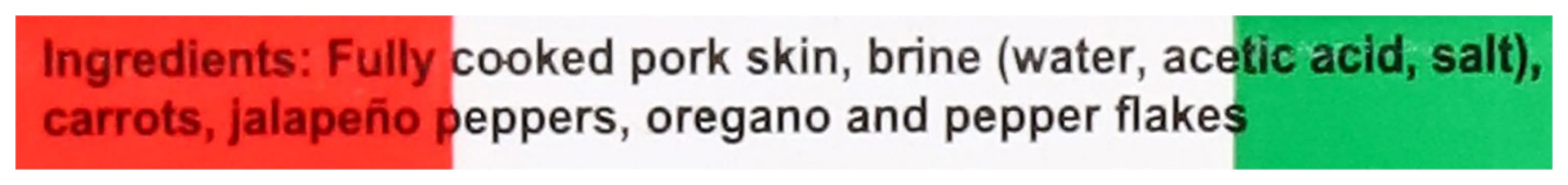Ingredients: Pork Skins, Water, Vinegar, Salt, Carrot Slices, Jalapeno Pepper Slices, Citric Acid, Onions, Oregano.