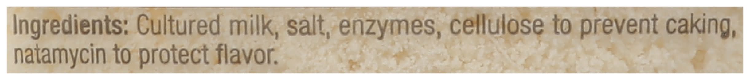 Ingredients: Cultured Milk, Salt, Enzymes, Cellulose to Prevent Caking, Natamycin to Protect Flavor Contains: Milk