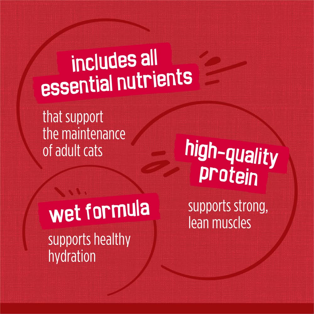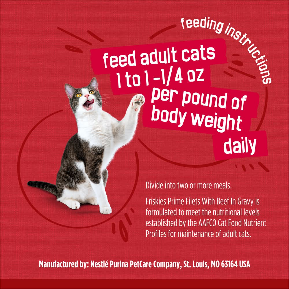 Give your cat the meaty goodness she craves when you fill her dish with Filets With Beef in Gravy cat food. Real beef delivers the decadent taste she desires, and the tender shredded chunks give her something delicious to sink her teeth into. Savory gravy adds to the mouthwatering, moist cat food texture to make every bite a tasty delight, and the rich aroma lets her know that a delectable meal is just around the corner. Each Friskies Prime Filets wet cat food serving contains 100 percent complete and balanced nutrition for the healthy maintenance of adult cats with no artificial colors or preservatives, so she can enjoy this adult cat food at every stage of her playful, happy adult life. Satisfy her hunger for meaty morsels when you offer up this Purina Friskies canned cat food recipe and show her just how much you care about her health and happiness. Packaging: Reusable