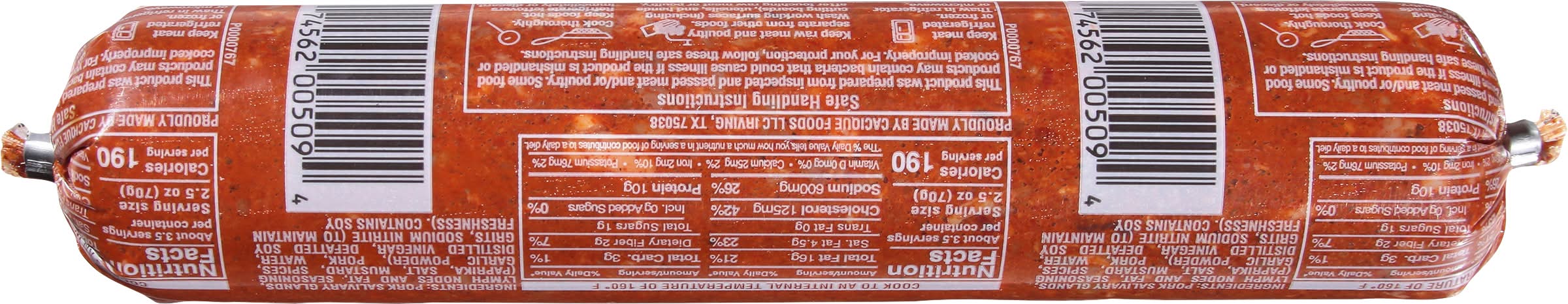 Directions for use: Safe Handling Instructions: This product was prepared from inspected and passed meat and/or poultry. Some food products may contain bacteria that could cause illness if the product is mishandled or cooked improperly. For your protection, follow these safe handling instructions. Keep refrigerated or frozen. Thaw in refrigerator or microwave. Keep raw meat and poultry separate from other foods. Wash working surfaces (including cutting boards), utensils, and hands after touching raw meat or poultry. Cook thoroughly. Keep hot foods hot. Refrigerate leftovers immediately or discard. Cook to an internal temperature of 160 degrees F. Remove casing before cooking. Cook before eating. Keep refrigerated. Storage recommendation: Keep refrigerated.
