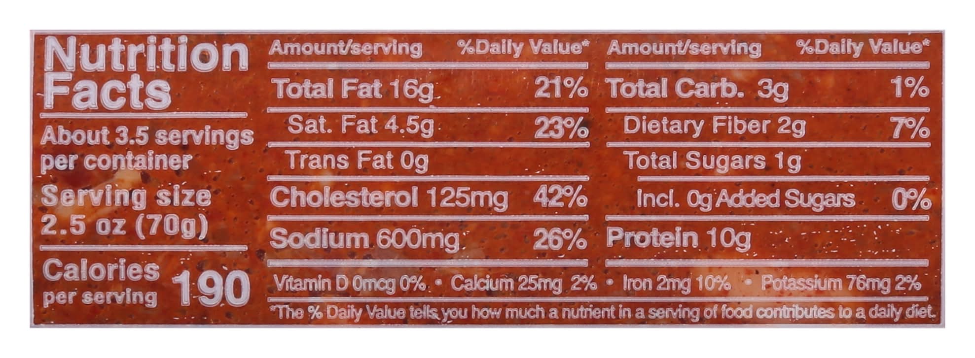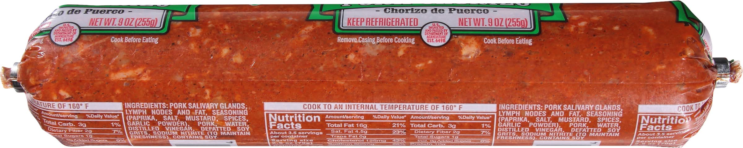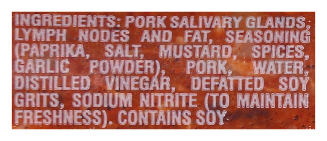 Ingredients: Pork Salivary Glands, Lymph Nodes and Fat, Seasoning (Paprika, Salt, Mustard, Spices, Garlic Powder), Pork, Water, Distilled Vinegar, Defatted Soy Grits, Sodium Nitrite (to Maintain Freshness) Contains: Soybeans, Mustard