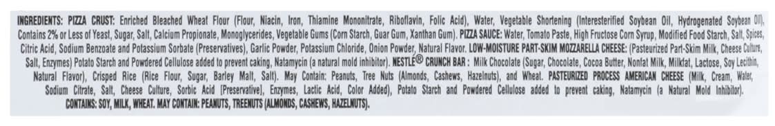 Ingredients: Pizza Crust: Enriched Bleached Wheat Flour (Flour, Niacin, Iron, Thiamine Mononitrate, Riboflavin, Folic Acid), Water, Vegetable Shortening (Interesterified Soybean Oil, Hydrogenated Soybean Oil), Contains 2% or Less of Yeast, Sugar, Salt, Calcium Propionate, Monoglycerides, Vegetable Gums (Corn Starch, Guar Gum, Xanthan Gum), Pizza Sauce: Water, Tomato Paste, High Fructose Corn Syrup, Modified Food Starch, Salt, Spices, Citric Acid, Sodium Benzoate and Potassium Sorbate (Preservatives), Garlic Powder, Potassium Chloride, Onion Powder, Natural Flavor, Low-Moisture Part-Skim Mozzarella Cheese: (Pasteurized Part-Skim Milk, Cheese Culture, Salt, Enzymes) Potato Starch and Powdered Cellulose Added to Prevent Caking, Natamycin (a Natural Mold Inhibitor), Nestle Crunch Bar : Milk Chocolate (Sugar, Chocolate, Cocoa Butter, Nonfat Milk, Milkfat, Lactose, Soy Lecithin, Natural Flavor), Crisped Rice (Rice Flour, Sugar, Barley Malt, Salt). Pasteurized Process American Cheese (Milk, Cream, Water, Sodium Citrate, Salt, Cheese Culture, Sorbic Acid [Preservative], Enzymes, Lactic Acid, Color Added), Potato Starch and Powdered Cellulose Added to Prevent Caking, Natamycin (a Natural Mold Inhibitor) Contains: Wheat, Soybeans, Corn, Milk, Lactose, Barley, Peanuts, Tree Nuts, Tree Nuts, Almonds, Tree Nuts, Cashews, Tree Nuts, Hazelnuts/Filberts