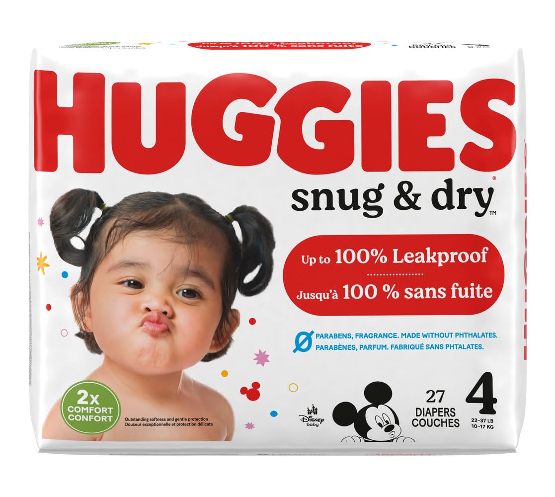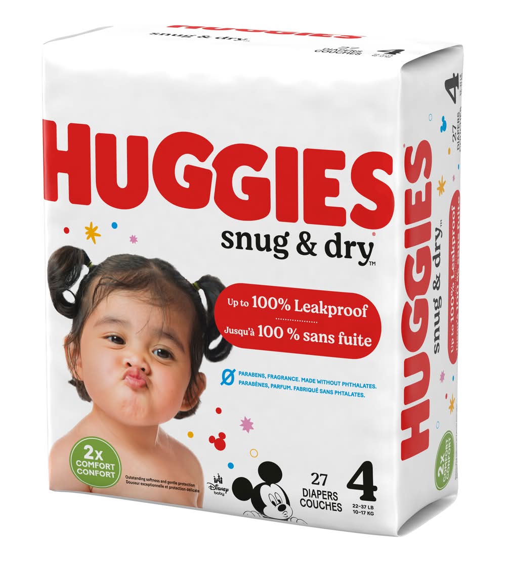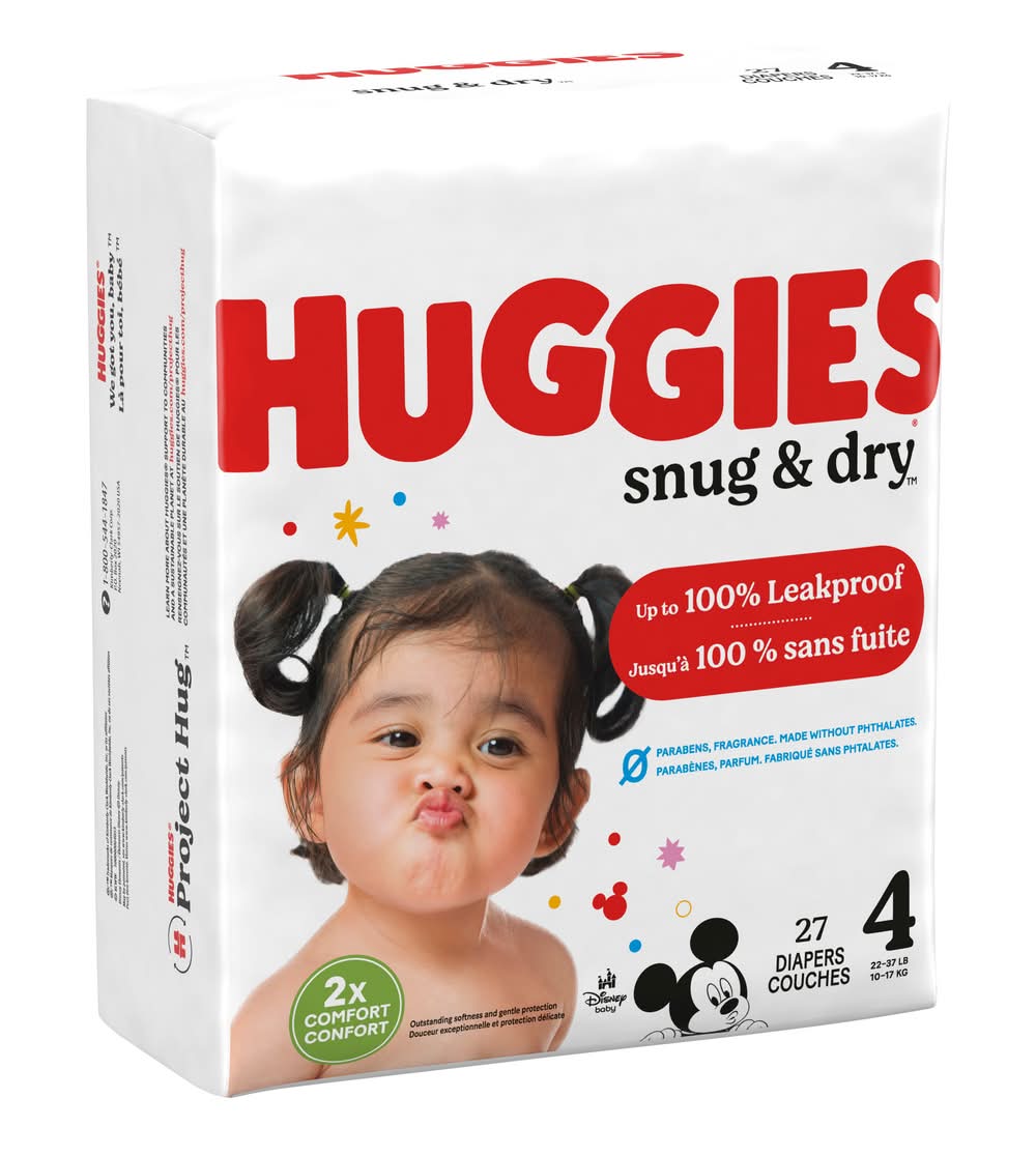 Huggies Snug & Dry Baby Diapers, Size 4 (22-37 lbs), 27 Ct • Size: Size 4 • Kimberly-Clark Global Sales, LLC, Neenah,WI,54956 • Packaging: Reusable