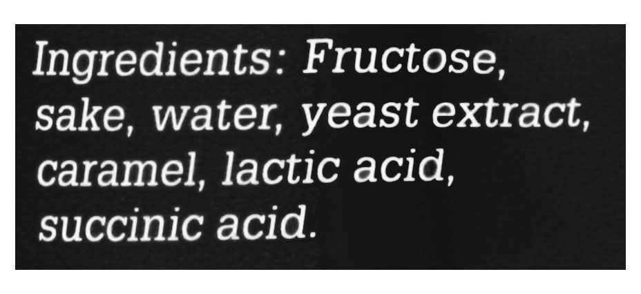Ingredients: Fructose, Sake, Water, Yeast Extract, Caramel, Lactic Acid, Succinic Acid