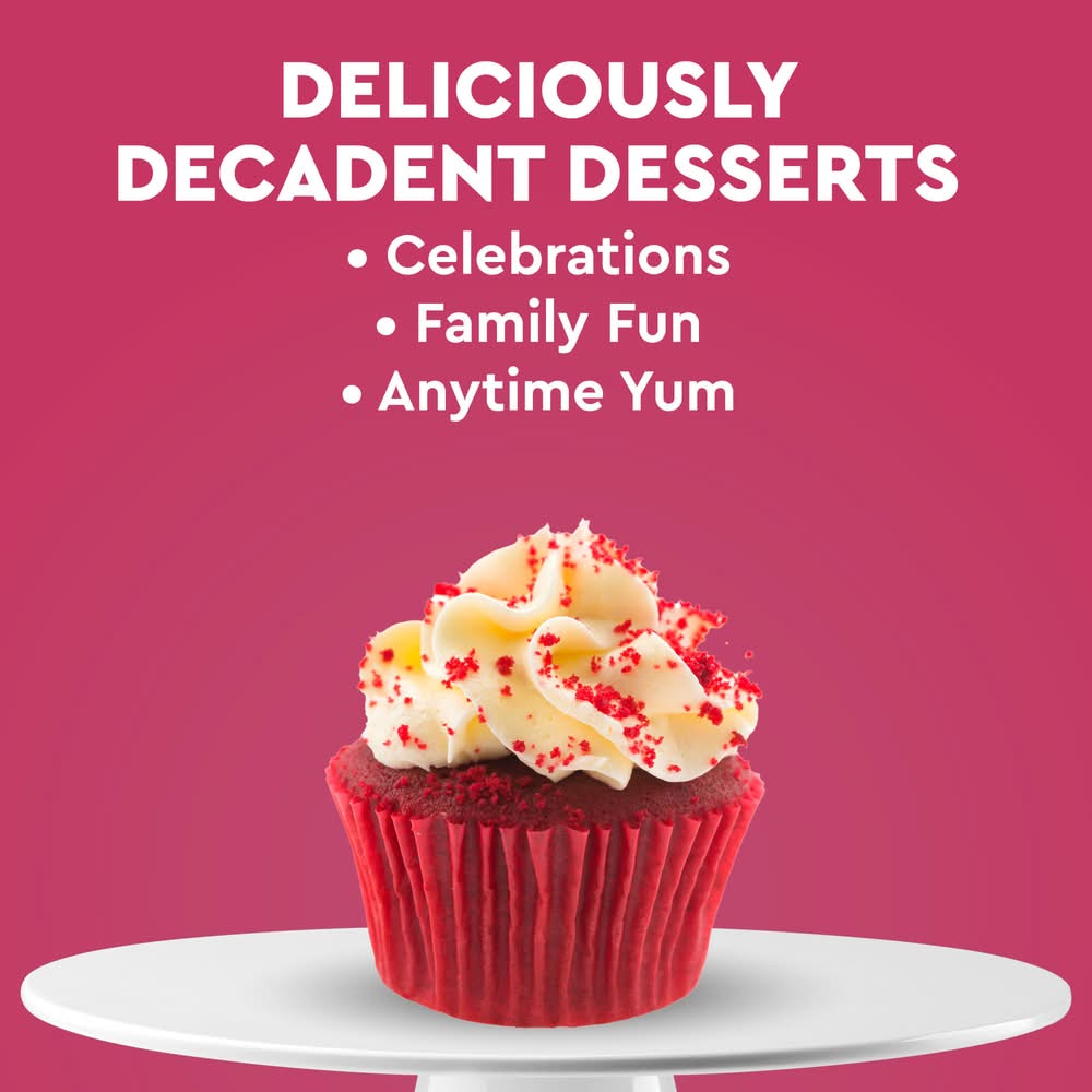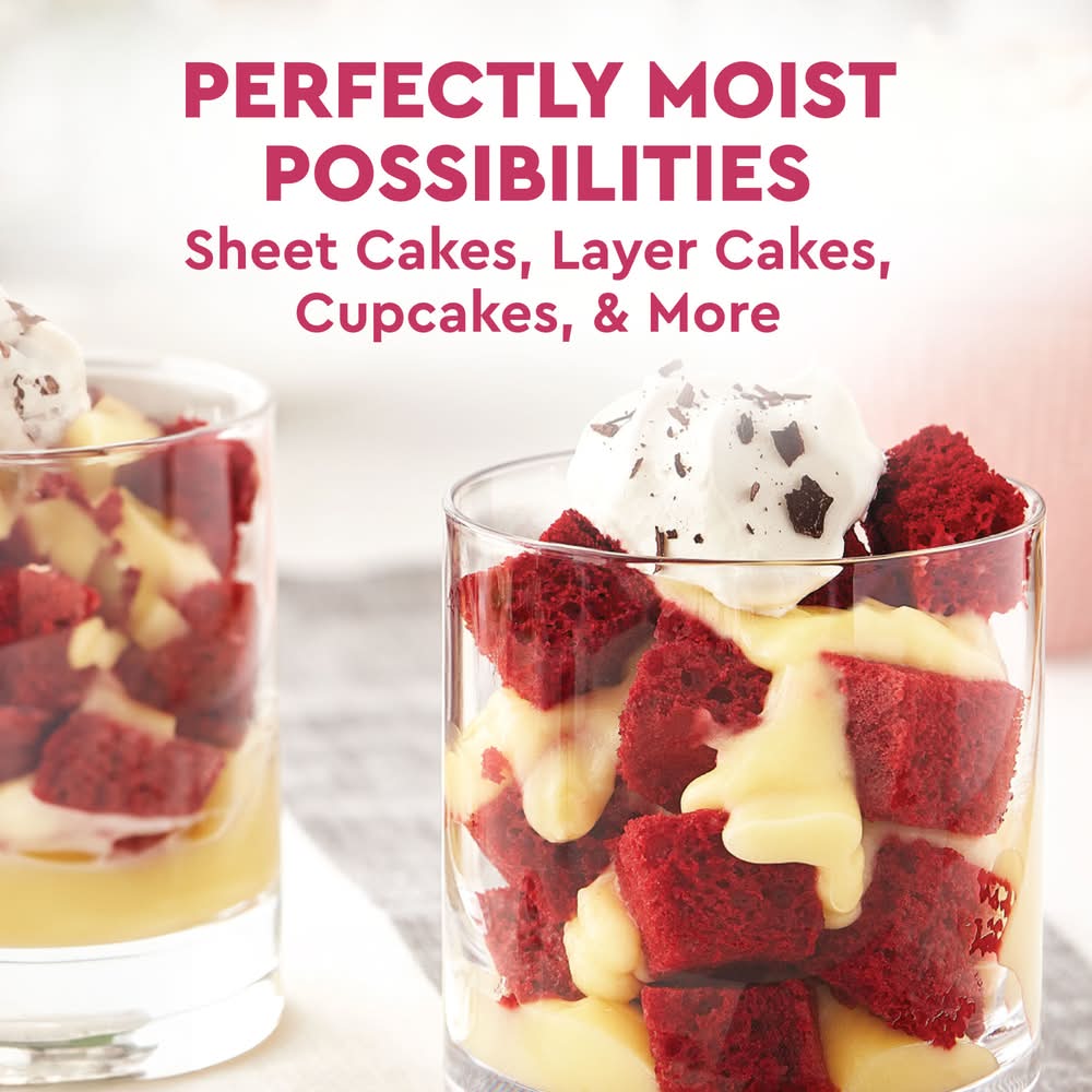 Duncan Hines Perfectly Moist Red Velvet Cake Mix makes a moist and delicious red velvet cake that is sure to become a family favorite. The smooth and velvety cake batter makes it easy to bake a perfectly moist cake every time. Simply add water, egg whites and vegetable oil to the baking mix and stir to combine. Pour into a pan and bake for the recommended time in the instructions. Prepare this red velvet cake mix to make red velvet trifle cups, a decadent layer cake with frosting or add sprinkles for a festive birthday cake. You can also use it as a cupcake mix, or to make fun cake creations like cake pops. This certified Kosher boxed cake mix makes one 8 or 9 inch layer cake, one 13 x 9 inch sheet cake or 24 cupcakes. From birthday cake to single serve desserts, Duncan Hines has you covered when you're ready to bake and create. Bake someone happy! Conagra Brands, PO Box 3534, Chicago, IL, 60654