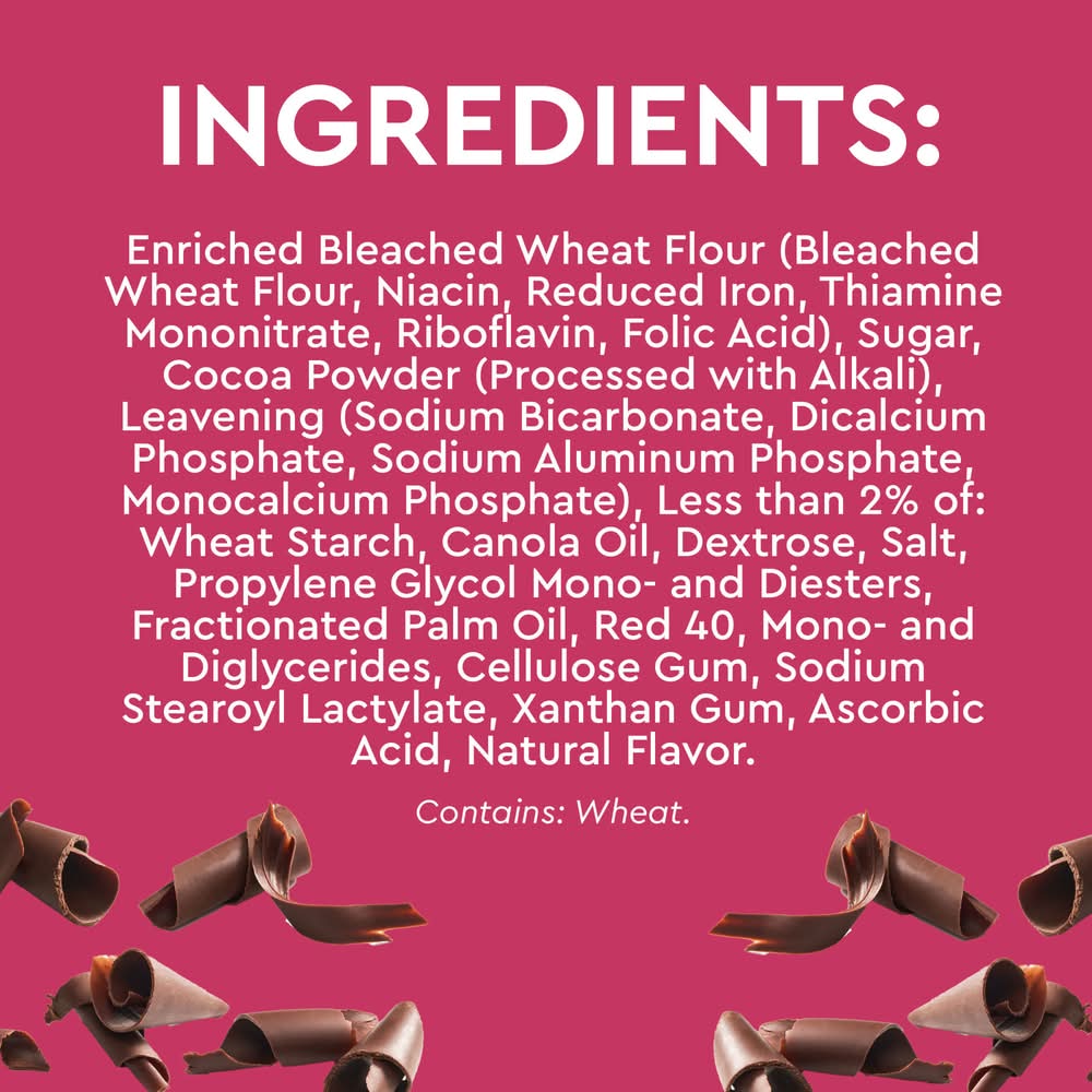 Ingredients: INGREDIENTS: SUGAR, ENRICHED BLEACHED WHEAT FLOUR (WHEAT FLOUR, NIACIN, REDUCED IRON, THIAMINE MONONITRATE, RIBOFLAVIN, FOLIC ACID), EMULSIFIED PALM SHORTENING (PALM OIL, PROPYLENE GLYCOL MONO- AND DIESTERS OF FATS AND FATTY ACIDS, MONO- AND DIGLYCERIDES, SODIUM STEAROYL LACTYLATE), COCOA POWDER PROCESSED WITH ALKALI, LEAVENING (BAKING SODA, DICALCIUM PHOSPHATE, SODIUM ALUMINUM PHOSPHATE, MONOCALCIUM PHOSPHATE), CONTAINS 2% OR LESS OF: WHEAT STARCH, DEXTROSE, SALT, PALM OIL, RED 40, CELLULOSE GUM, XANTHAN GUM. Contains: Wheat