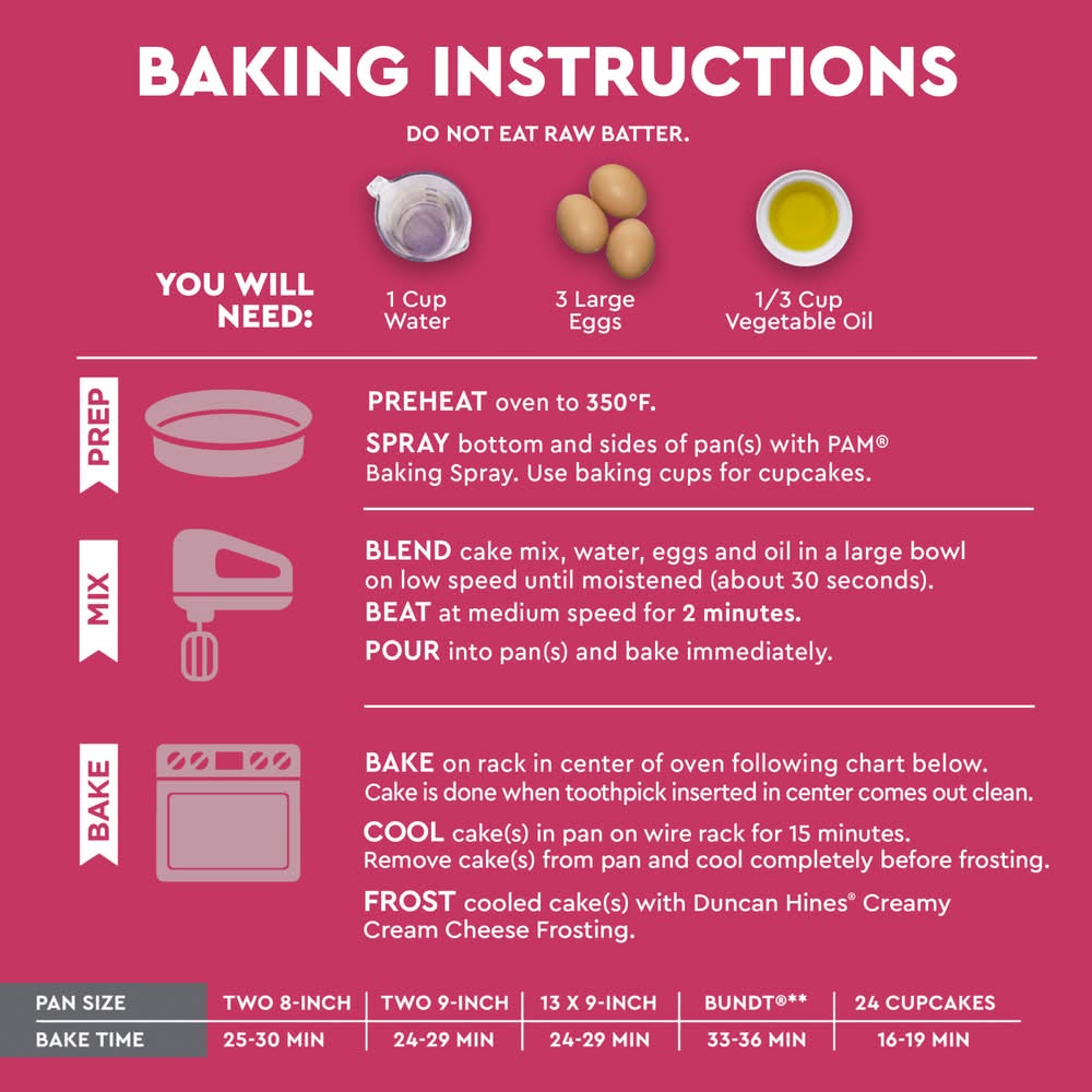 You will need: 1 cup water; 3 large eggs; 1/2 cup vegetable oil. do not eat raw better. baking instructions: step 1: prep: preheat oven to 350 degrees f. spray bottom and sides of pan(s) with pam baking spray. use baking cups for cupcakes. step 2: mix: blend cake mix, water, eggs and oil in a large bowl on low speed until moistened (about 30 seconds). beat at medium speed for 2 minutes. pour into pan(s) and bake immediately. step 3: bake on rack in center of oven following chart below. cake is done when toothpick inserted in center comes out clean. cool cake(s) in pan on wire rack 15 minutes. remove cake(s) from pan and cool completely before frosting. frost cooled cake(s) with duncan hines creamy cream cheese frosting. try these ingredient swaps: replace 1 cup of water with: 1 cup of your favorite dairy or plant-based milk. replace 1/2 cup of vegetable oil with: 1/2 cup greek yogurt, refined coconut oil or applesauce. high altitude (over 3,500 ft): preheat oven to 350 degrees f. stir 2 tablespoons of flour into cake mix, add 1/2 cup oil, 1 cup water, and 3 eggs. blend as directed in step 2. bake at 350 degrees f. two 8-inch pans 26-30 min; 13 x 9-inch pan 26-30 min; 24 cupcakes 18-21 min. pan size: two 8-inch; bake time: 24-28 min. pan size: two 9-inch; bake time: 24-29 min. pan size: 13 x 9-inch; bake time: 24-29 min. pan size: bundt; bake time: 33-36 min. pan size: 24 cupcakes; bake time: 16-19 min. creative tip: try substituting 1 cup buttermilk for water in batter for a richer red velvet-y taste