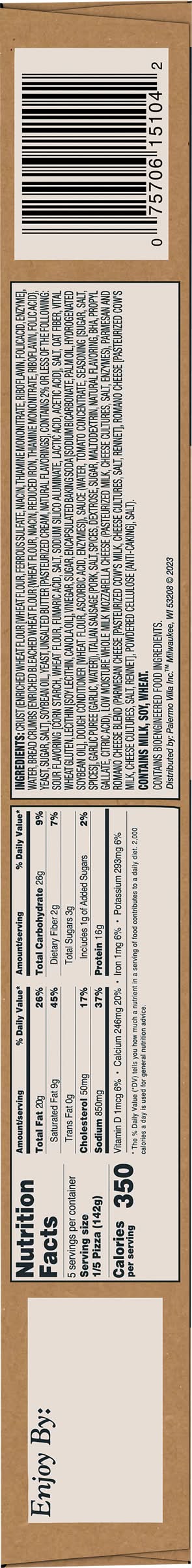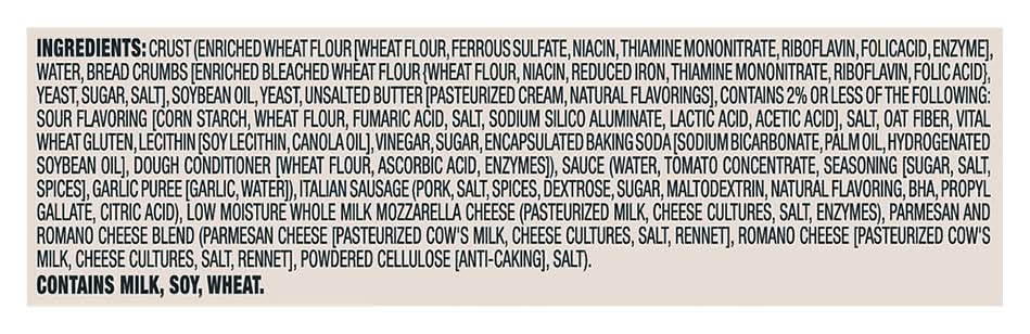 Ingredients: Crust (Enriched Wheat Flour Wheat Flour, Ferrous Sulfate, Niacin, Thiamine Mononitrate, Riboflavin, Folic Acid, Enzyme], Water, Bread Crumbs [Enriched Bleached Wheat Flour (Wheat Flour, Niacin, Reduced Iron, Thiamine Mononitrate, Riboflavin, Folic Acid}, Yeast, Sugar, Salt], Soybean Oil, Yeast, Unsalted Butter (Pasteurized Cream, Natural Flavorings], Contains 2% or Less of the Following: Sour Flavoring [Corn Starch, Wheat Flour, Fumaric Acid, Salt, Sodium Silico Aluminate, Lactic Acid, Acetic Acid], Salt, Oat Fiber, Vital Wheat Gluten, Lecithin [Soy Lecithin, Canola Oili, Vinegar, Sugar, Encapsulated Baking Soda [Sodium Bicarbonate, Palm Oil, Hydrogenated Soybean Oil], Dough Conditioner [Wheat Flour, Ascorbic Acid, Enzymes]), Sauce (Water, Tomato Concentrate, Seasoning [Sugar, Salt, Spices], Garlic Puree [Garlic, Water]), Italian Sausage (Pork, Salt, Spices, Dextrose, Sugar, Maltodextrin, Natural Flavoring, BHA, Propyl Gallate, Citric Acid), Low Moisture Whole Milk Mozzarella Cheese (Pasteurized Milk, Cheese Cultures, Salt, Enzymes), Parmesan and Romano Cheese Blend (Parmesan Cheese [Pasteurized Cow's Milk, Cheese Cultures, Salt, Rennet], Romano Cheese [Pasteurized Cow's Milk, Cheese Cultures, Salt, Rennet], Powdered Cellulose [Anti-Caking], Salt) Contains: Milk, Soybeans, Wheat, Corn, Gluten
