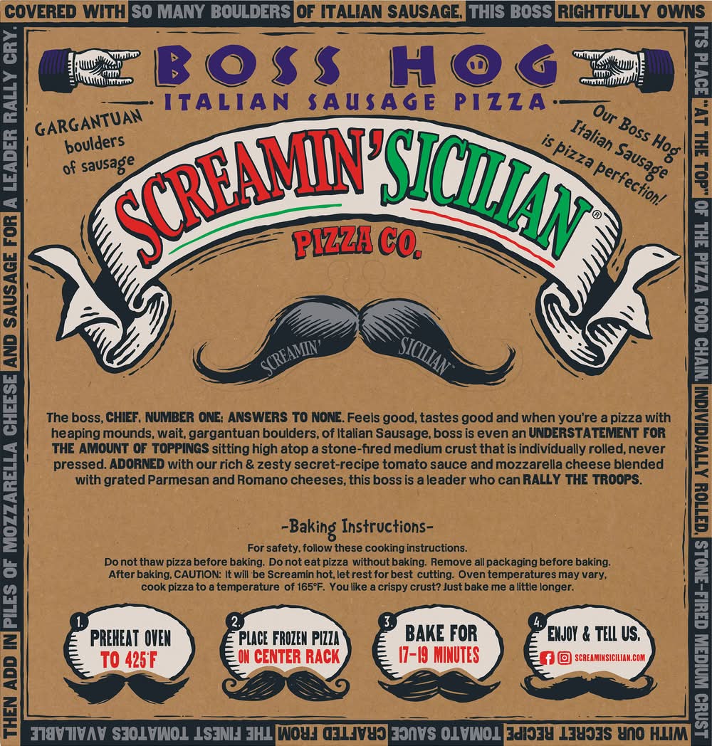 Pizza, Italian Sausage, Boss Hog • Number of servings: 5 • Palermo Villa Inc., Milwaukee, WI, 53208, Ph: 855-YSCREAM • Packaging: Reusable