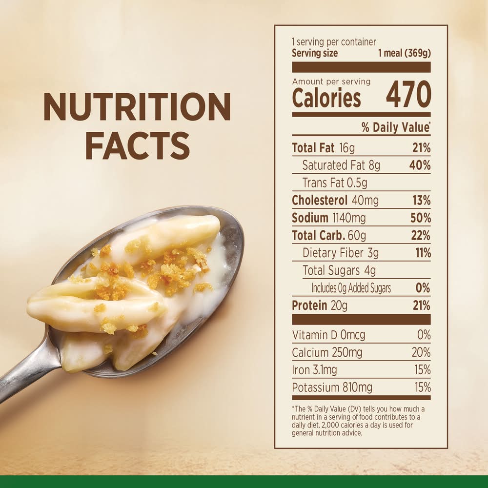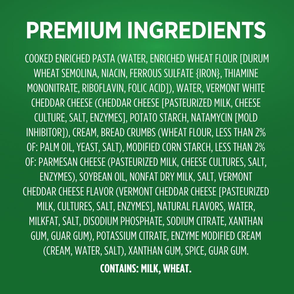 Ingredients: Cooked Enriched Pasta (Water, Durum Flour [Durum Wheat Semolina, Niacin, Ferrous Sulfate {Iron}, Thiamine Mononitrate, Riboflavin, Folic Acid]), Water, Vermont White Cheddar Cheese (Cheddar Cheese [Pasteurized Milk, Cheese Culture, Salt, Enzymes], Potato Starch, Powdered Cellulose [To Prevent Caking], Natamycin [Mold Inhibitor]), Cream, Bread Crumbs (Wheat Flour, less than 2% of: Palm Oil, Yeast, Salt), Modified Corn Starch, Contains 2% or less of: Parmesan Cheese (Pasteurized Milk, Cheese Cultures, Salt, Enzymes), Soybean Oil, Nonfat Dry Milk, Salt, Vermont Cheddar Cheese Flavor (Vermont Cheddar Cheese [Pasteurized Milk, Cultures, Salt, Enzymes], Natural Flavors, Water, Milkfat, Salt, Disodium Phosphate, Sodium Citrate, Xanthan Gum, Guar Gum), Sodium Phosphates, Enzyme Modified Cream (Cream, Water, Salt), Xanthan Gum, Spice, Guar Gum, . CONTAINS: MILK, WHEAT. Contains: Milk, Wheat