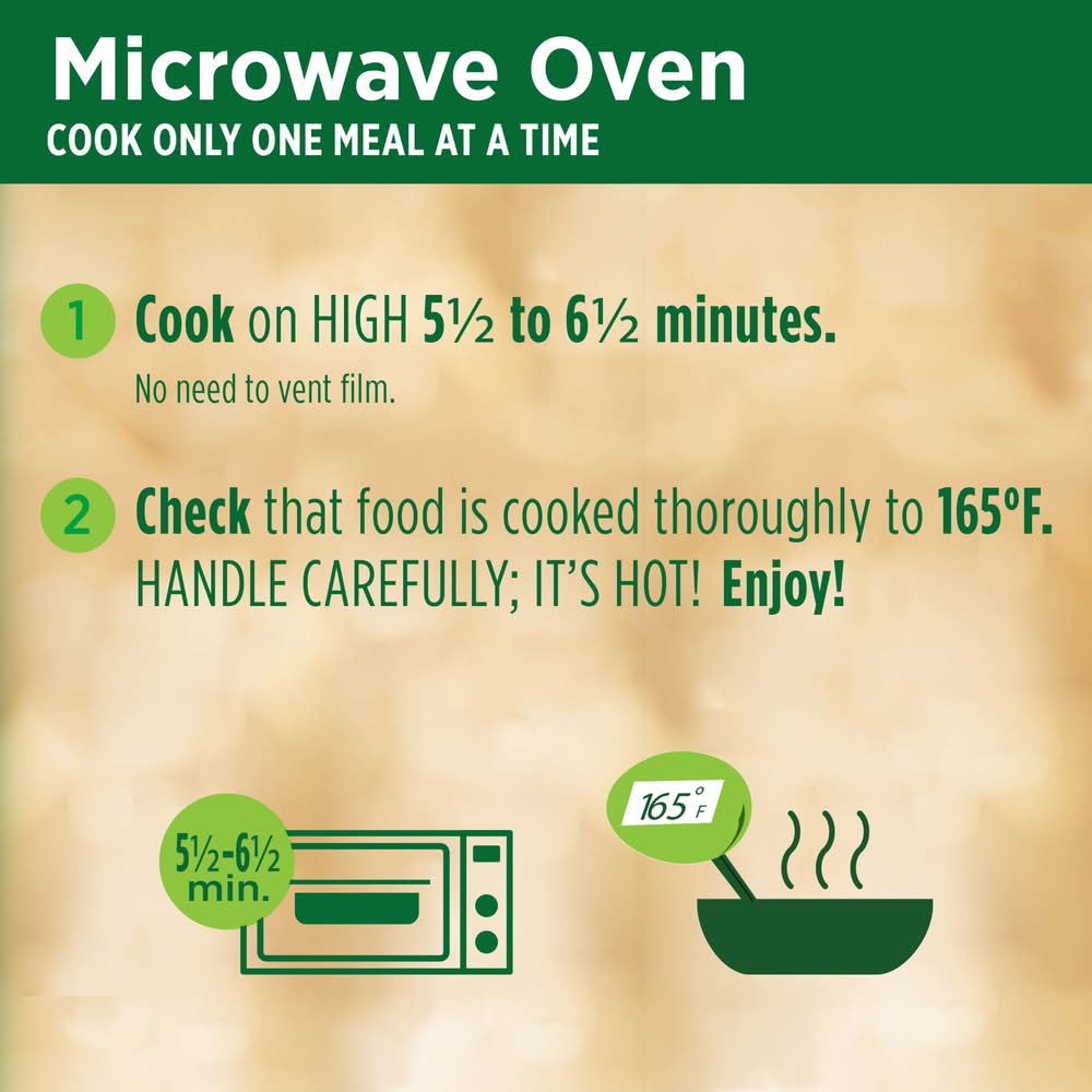 Directions for use: Must be cooked thoroughly. Microwave Oven: Cook only one at a time. Cook on high 5-1/2 to 6-1/2 minutes. No need to vent film. Check that food is cooked thoroughly to 165 degrees F. Handle carefully, it's hot! Stir and enjoy! Conventional Oven: Do not prepare in toaster oven. Preheat oven to 375 degrees F. Cook on baking sheet in center of oven 45 minutes. Check that food is cooked thoroughly to 165 degrees F. Handle carefully; it's hot! Let stand 2 minutes. Stir and enjoy! Food Safety and Quality: Keep frozen. Do not thaw. Microwave directions developed with 1100-watt microwave ovens. Appliances vary. Adjust cooking times as needed. Food must be cooked thoroughly to 165 degrees F. Keep frozen. Storage recommendation: Keep frozen.