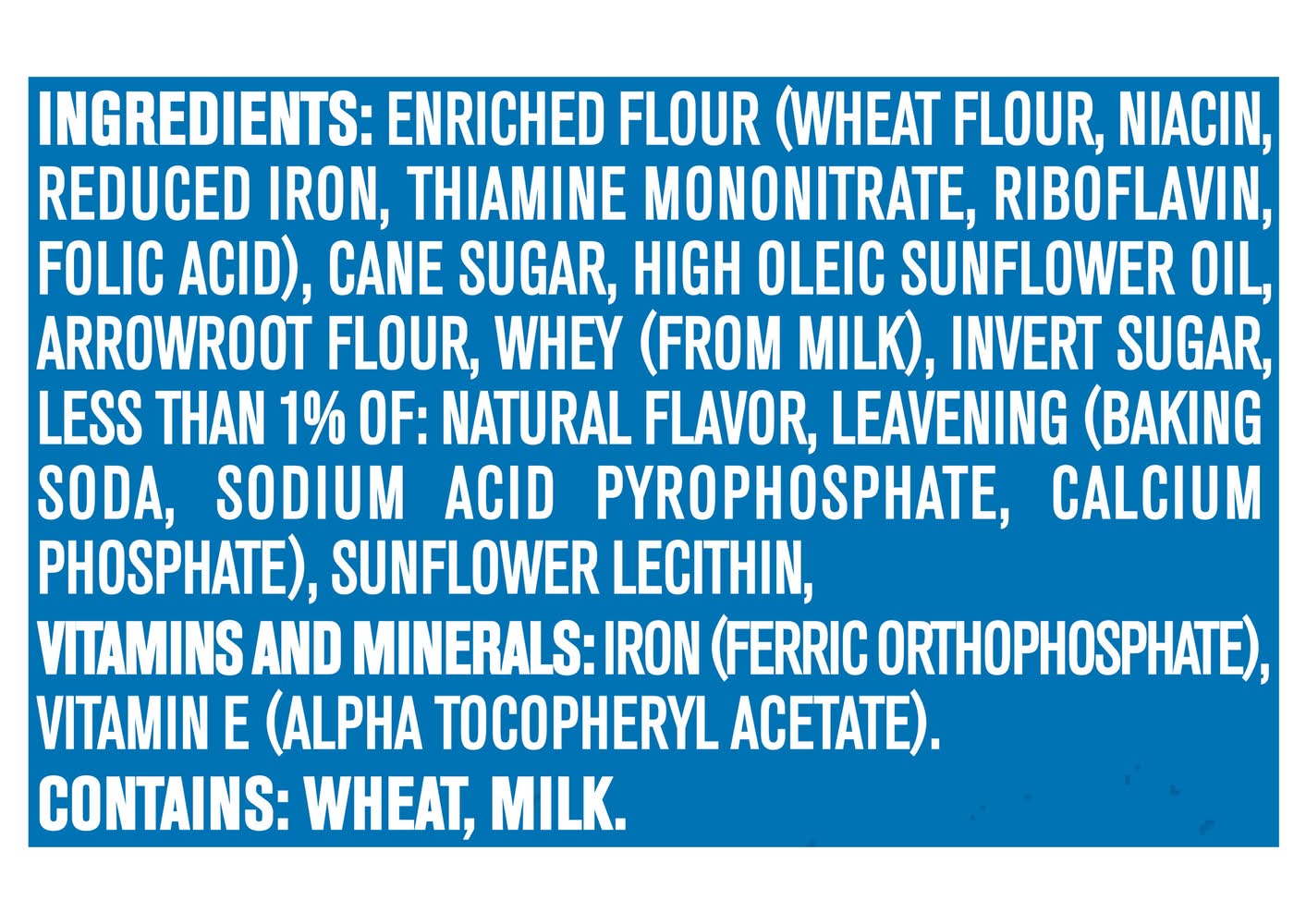 Ingredients: Enriched Flour (Wheat Flour, Niacin, Reduced Iron, Thiamine Mononitrate, Riboflavin, Folic Acid), Cane Sugar, High Oleic Sunflower Oil, Arrowroot Flour, Whey (from Milk), Invert Sugar, Less than 1% of: Natural Flavor, Leavening (Baking Soda, Sodium Acid Pyrophosphate, Calcium Phosphate), Sunflower Lecithin, Vitamins and Minerals: Iron (Ferric Orthophosphate), Vitamin E (Alpha Tocopheryl Acetate) Contains: Wheat, Milk