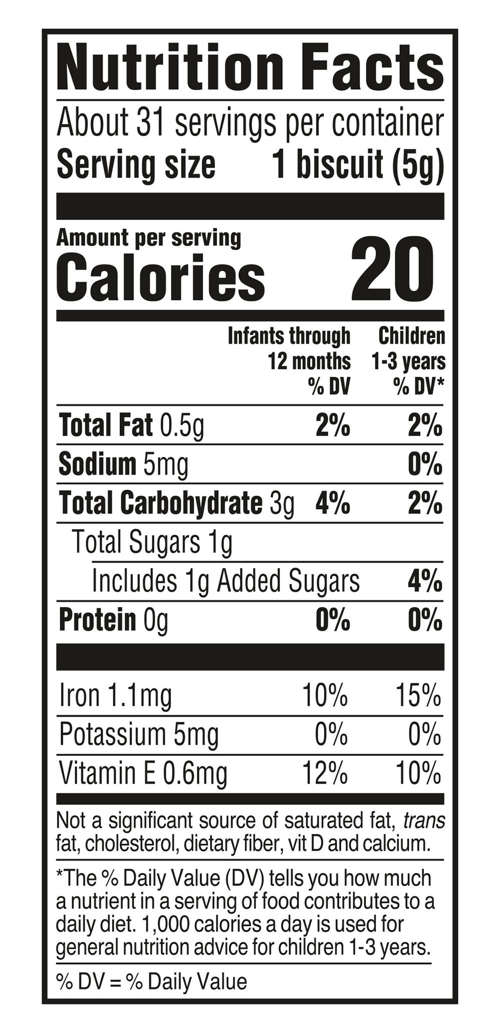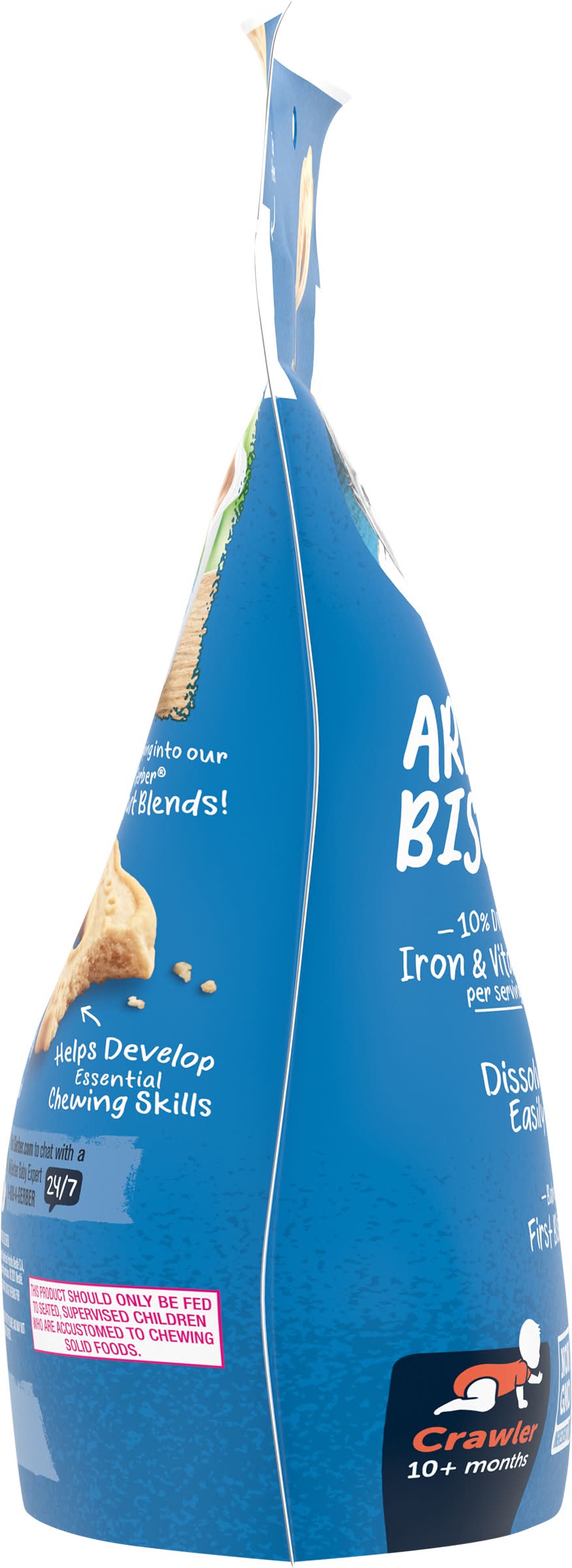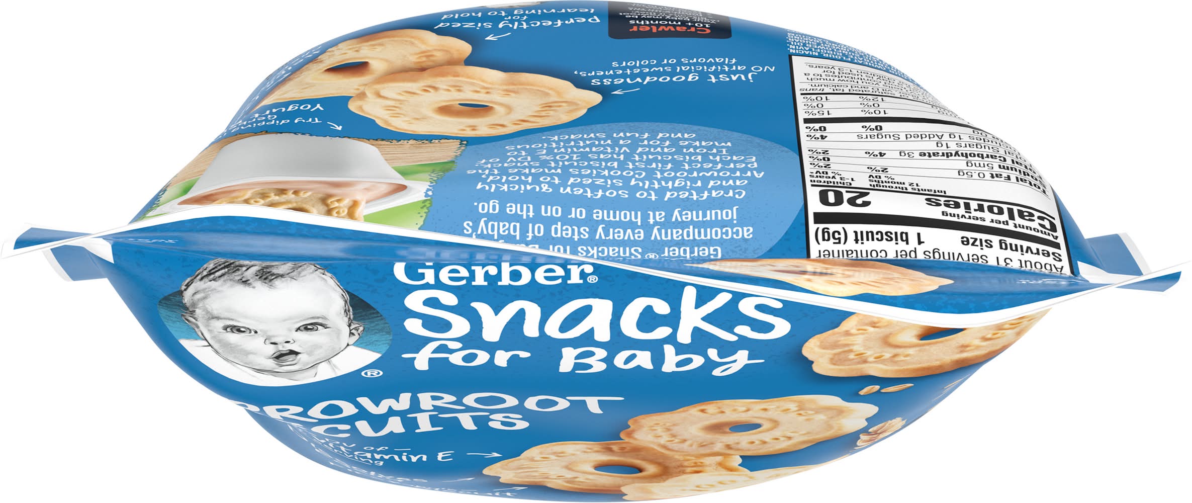 This is for Crawler. No artificial sweeteners, flavors or colors. 10% DV of iron and vitamin E per serving. Dissolves easily. Baby's first biscuit. Your little one's first biscuit. Gerber Snacks for Baby accompany every step of baby's journey at home or on the go. Crafted to soften quickly and rightly sized to hold, Arrowroot Cookies make the perfect first biscuit snack. Each biscuit has 10% DV of Iron and Vitamin E to make for a nutritious and fun snack. Try dipping into our Gerber Yogurt Blends! Just goodness. Crawl without tummy on the floor. Start using fingers to eat. Start using jaw to mash food. Perfectly sized for learning to hold. Helps develop essential chewing skills. This package is sold by weight, not volume, and may not appear full due to settling of contents. • Size: 10+ Months • Gerber Products Co., Fremont,MI,49413,USA
