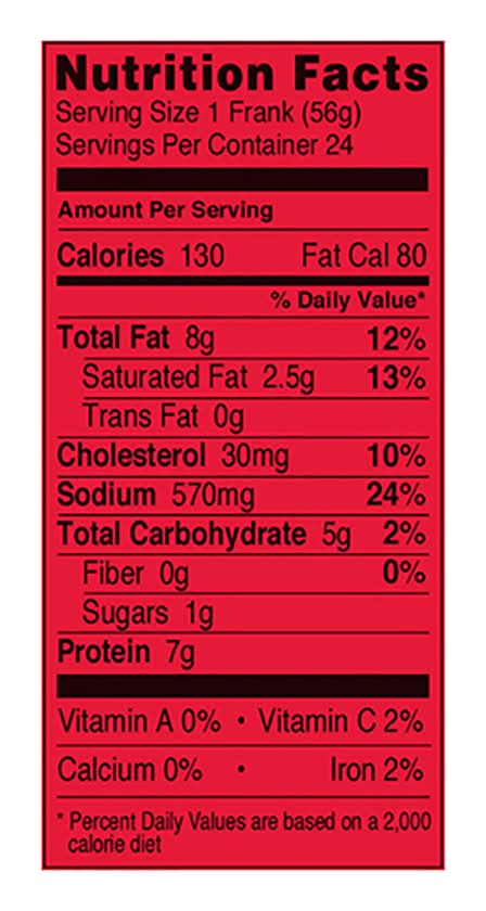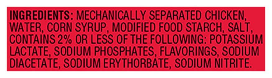 Ingredients: Mechanically Separated Chicken, Water, Corn Syrup, Modified Food Starch, Salt, Contains 2% or Less of the Following: Potassium Lactate, Sodium Phosphates, Flavorings, Sodium Diacetate, Sodium Erythorbate, Sodium Nitrite