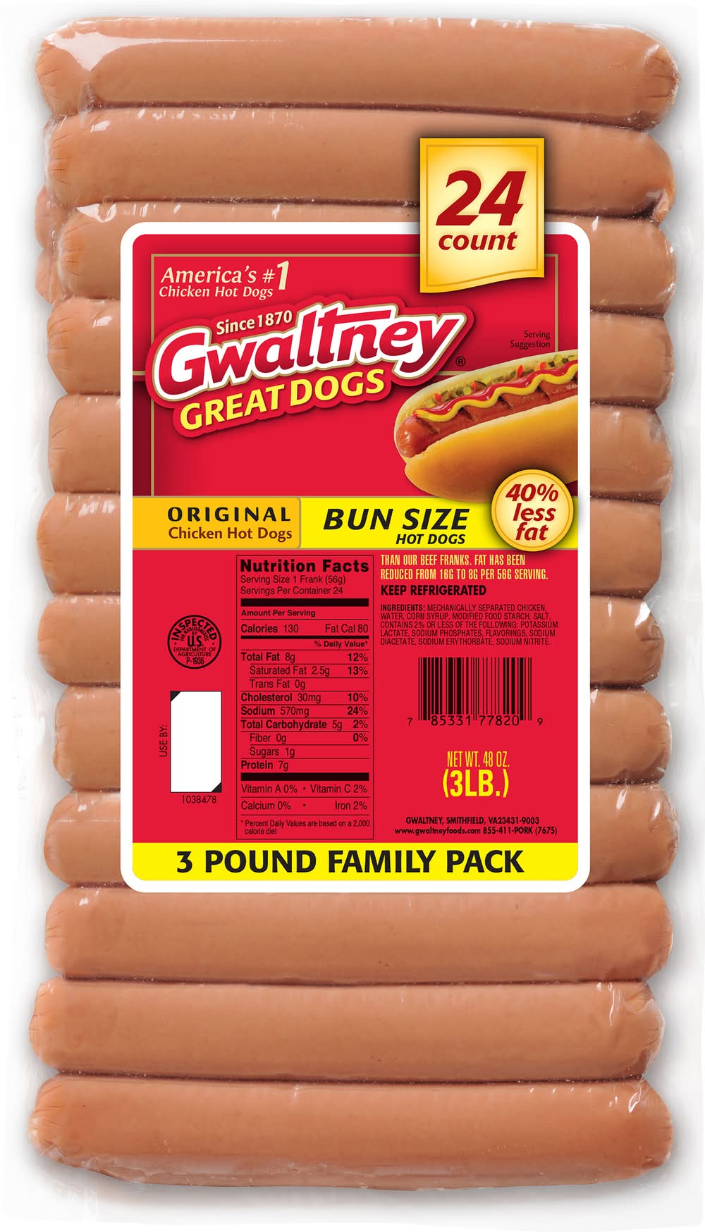 Gwaltney Original Bun Size Chicken Hot Dogs Family pack (3 lbs, 24 ct)