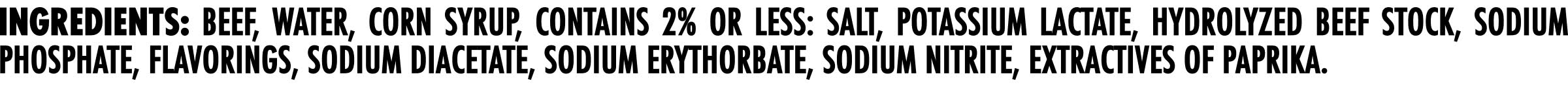 Ingredients: Beef, Water, Corn Syrup, Contains 2% Or Less: Salt, Potassium Lactate, Hydrolyzed Beef Stock, Sodium Phosphate, Flavorings, Sodium Diacetate, Sodium Erythorbate, Sodium Nitrite, Extractives Of Paprika Contains: Corn, Celery
