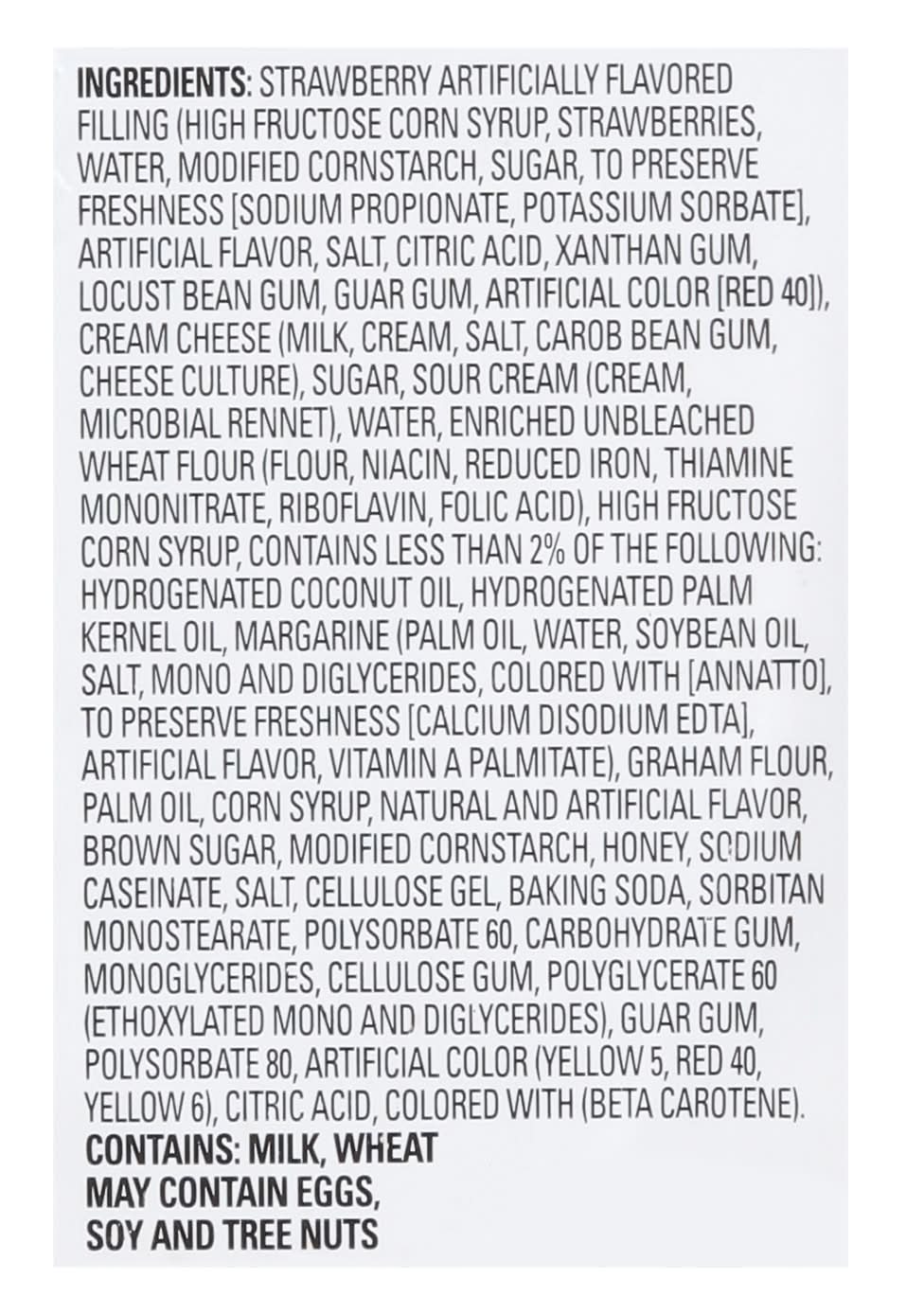 Ingredients: Strawberry Artificially Flavored Filling (High Fructose Corn Syrup, Strawberries, Water, Modified Corn Starch, Sugar, to Preserve Freshness [Sodium Propionate, Potassium Sorbate], Artificial Flavor, Salt, Citric Acid, Xanthan Gum, Locust Bean Gum, Guar Gum, Artificial Color [Red 40]), Cream Cheese [Milk, Cream, Salt, Carob Bean Gum, Cheese Culture], Sugar, Sour Cream (Cream, Microbial Rennet), Water, Enriched Unbleached Wheat Flour (Flour, Niacin, Reduced Iron, Thiamine Mononitrate, Riboflavin, Folic Acid), High Fructose Corn Syrup, Contains Less than 2% of the Following: Hydrogenated Coconut Oil, Hydrogenated Palm Kernel Oil, Margarine (Palm Oil, Water, Soybean Oil, Salt, Mono and Diglycerides, Colored with [Annatto], to Preserve Freshness [Calcium Disodium EDTA], Artificial Flavor, Vitamin A Palmitate), Graham Flour, Palm Oil, Corn Syrup, Natural and Artificial Flavor, Brown Sugar, Modified Cornstarch, Honey, Sodium Caseinate, Salt, Cellulose Gel, Baking Soda, Sorbitan Monostearate, Polysorbate 60, Carbohydrate Gum, Monoglycerides, Cellulose Gum, Polyglycerate 60 (Ethoxylated Mono and Diglycerides), Guar Gum, Polysorbate 80, Artificial Color (Yellow 5, Red 40, Yellow 6), Citric Acid, Colored with (Beta Carotene) Contains: Corn, Milk, Wheat, Tree Nuts, Coconuts, Soybeans, Eggs, Soybeans, Tree Nuts